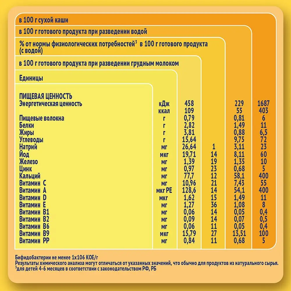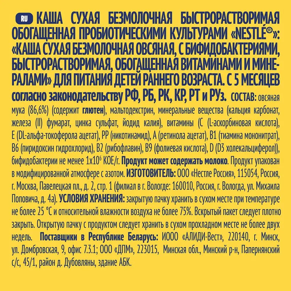 Состав: овсяная мука (содержит глютен), мальтодекстрин, витамины и минеральные вещества, бифидобактерии не менее 1х106 КОЕ/г. Продукт может содержать молоко. Содержит 9 витаминов и 5 минеральных веществ. Продукт упакован в модифицированной атмосфере с азотом.