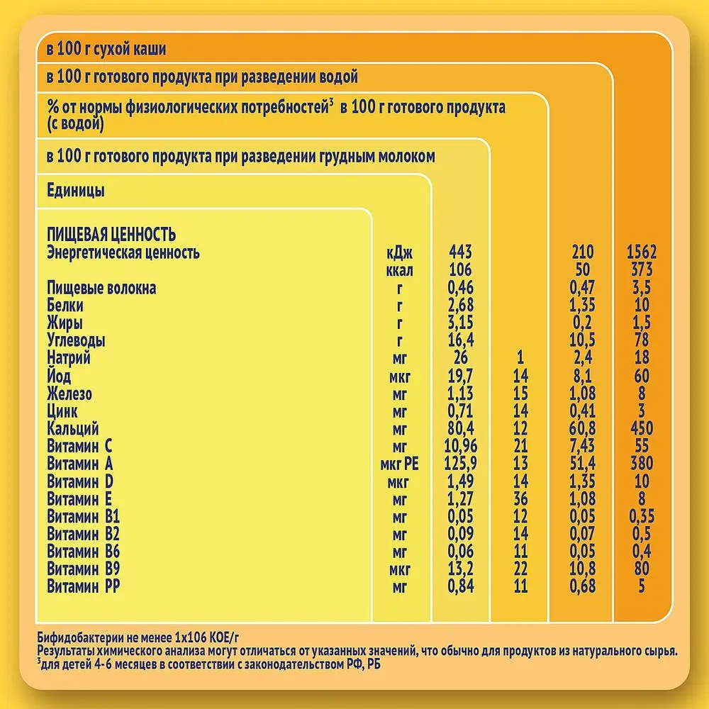 Состав: Мука пшеничная (содержит глютен), мука гречневая, мальтодекстрин, мука рисовая, мука кукурузная, мука овсяная (содержит глютен), витамины и минеральные вещества, бифидобактерии не менее 1х106 КОЕ/г. Продукт может содержать молоко. Содержит 9 витаминов и 5 минеральных веществ. Продукт упакован в модифицированной атмосфере с азотом.