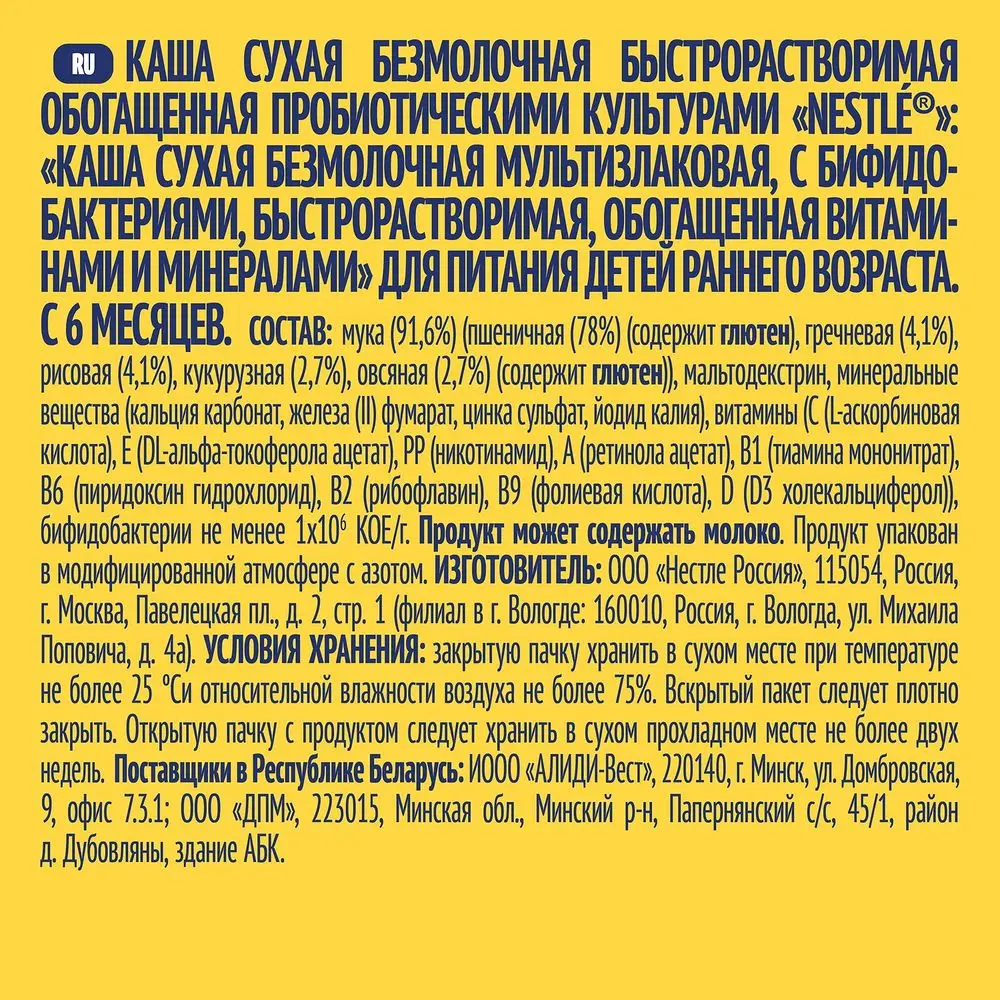 Идеальной пищей для грудного ребенка является молоко матери. Всемирная организация здравоохранения рекомендует исключительно грудное вскармливание в первые 6 месяцев и последующее введение прикорма при продолжении грудного вскармливания. Компания Нестле поддерживает данную рекомендацию. Каша Нестле «Мультизлаковая безмолочная» - с 6 мес. в соответствии с Законодательством РФ. Требуется консультация специалиста