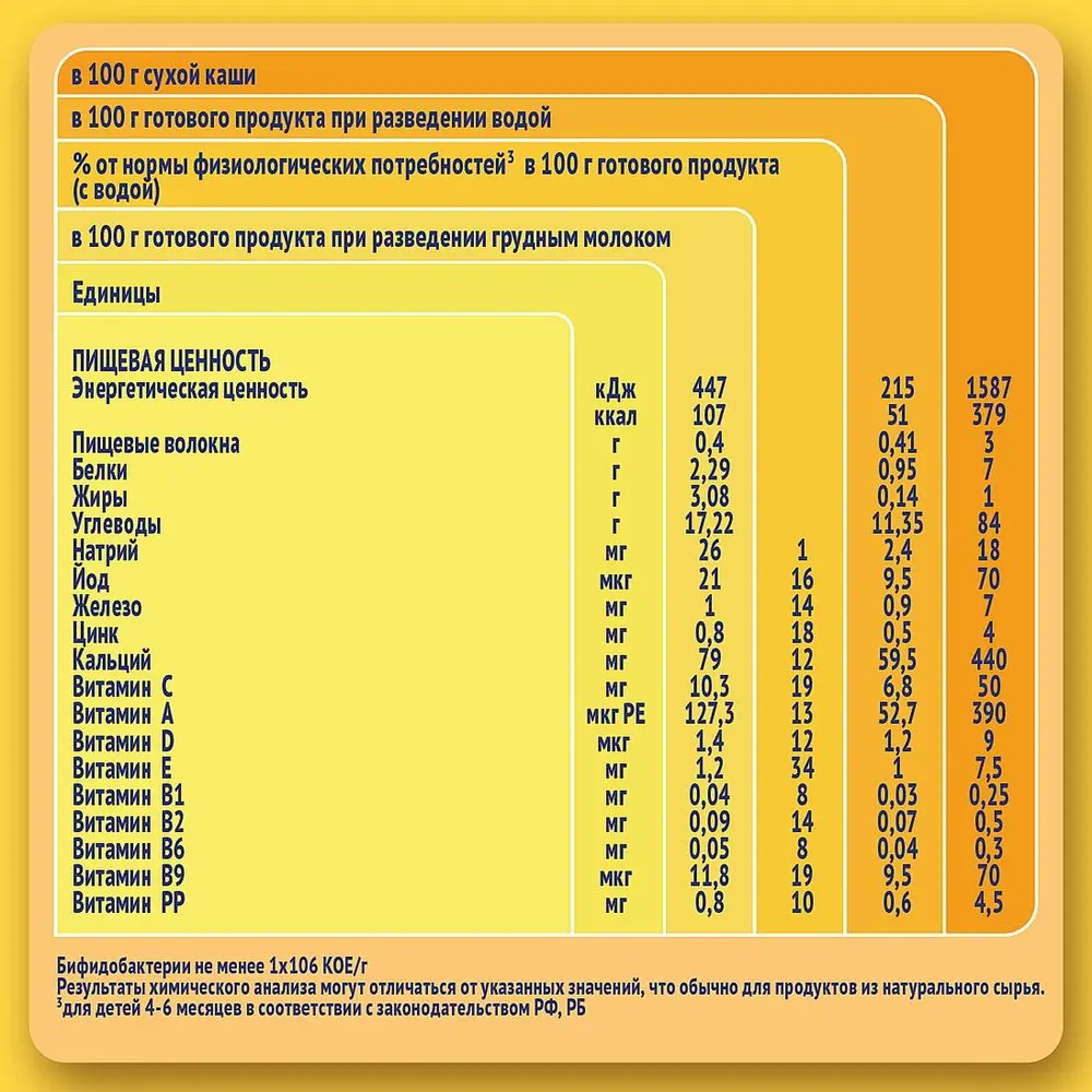 Состав: кукурузная мука, витамины и минеральные вещества, бифидобактерии не менее 1х106 КОЕ/г. Продукт может содержать глютен и молоко. Содержит 9 витаминов и 5 минеральных веществ. Продукт упакован в модифицированной атмосфере с азотом.