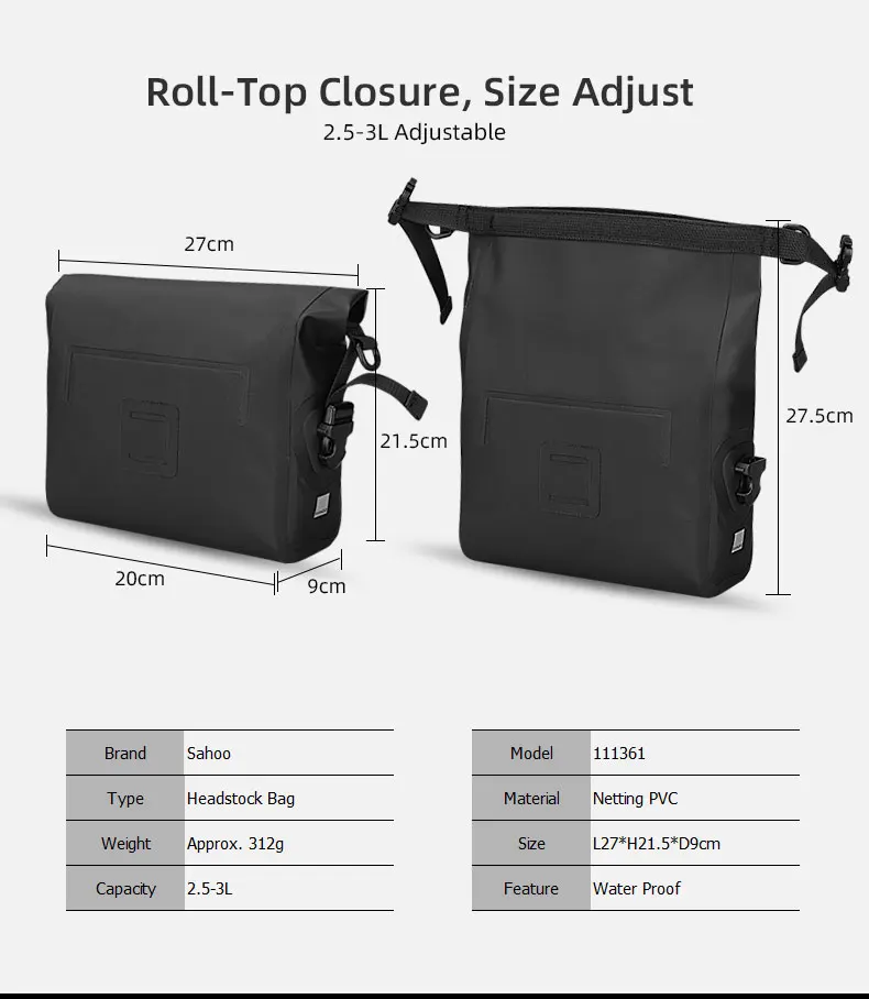 -Изготовлен из водонепроницаемого материала, проклеен швами, желательная Водонепроницаемая производительность; -Рулон-верхнее закрытие облегчает регулировку громкости для удовлетворения конкретных потребностей хранения; -Устойчивые к разрывам ткани, долговечные в использовании и легко чистятся при помощи протирания; -PE доска с подкладкой, чтобы представить сумку в твердой форме; -3-точечный застежка обеспечивает для того чтобы оставаться стабильным на руль; -Ремешок спереди в качестве вешалки для крепления предупреждающей лампы; -Поставляется с ремнем для ношения на плече.