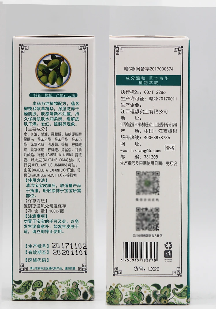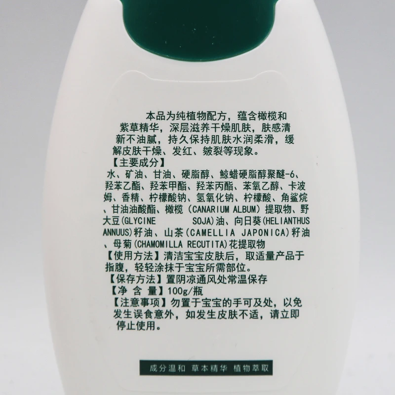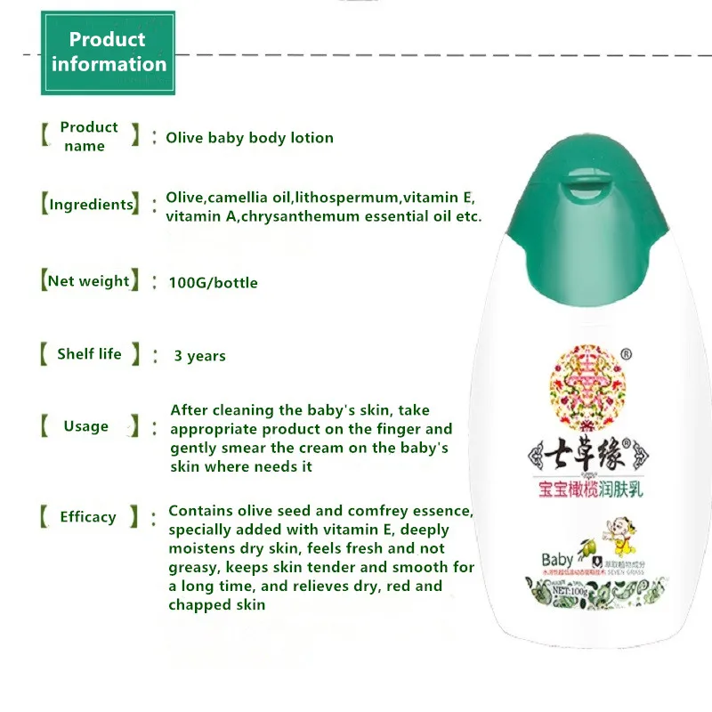 Название продукта: оливковый лосьон для тела Qicaoyuan Ингредиенты продукта: оливковое, масло камелии, литоспермам, витамин Е, витамин А, эфирное масло хризантемы и т. Д. Вес нетто: 100 г/бутылка Срок годности: 3 года Использование: После очистки кожи ребенка, возьмите соответствующий продукт на палец и аккуратно намажьте крем на кожу ребенка там, где это нужно Эффективность продукта: содержит оливковое и Комфри эссенции, специально добавляется с витамином Е, глубоко увлажняет сухую кожу, чувствует себя свежей и не жирной, сохраняет кожу нежной и гладкой в течение длительного времени, И снимает сухую, красную и потрескавшуюся кожу