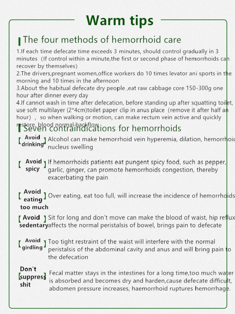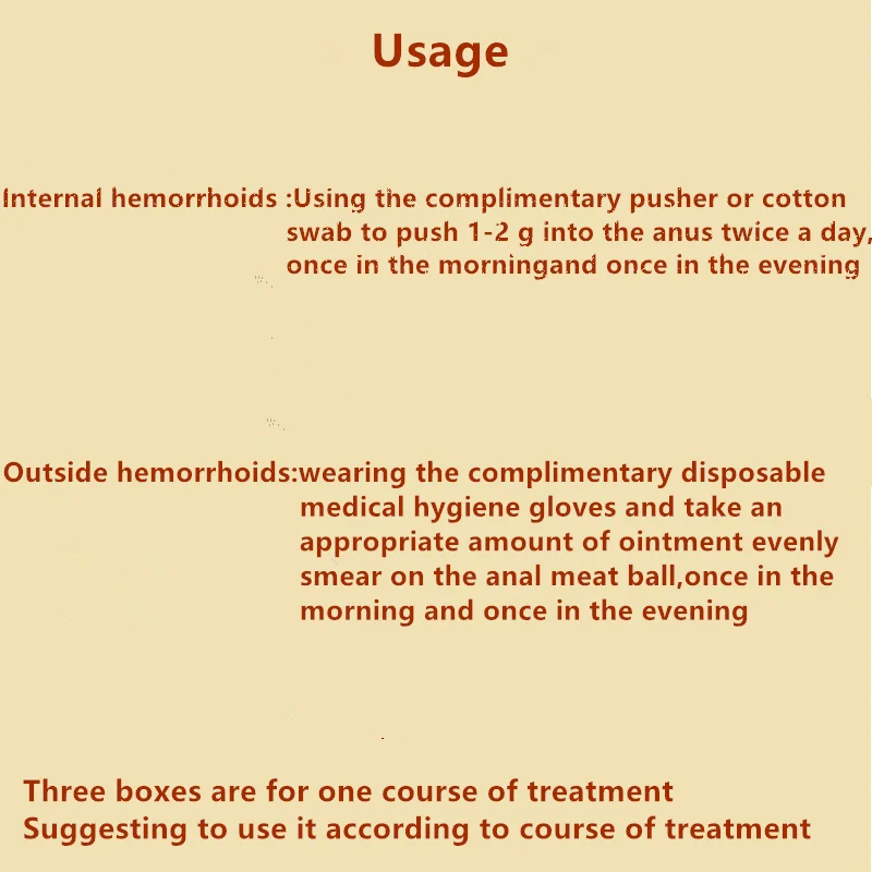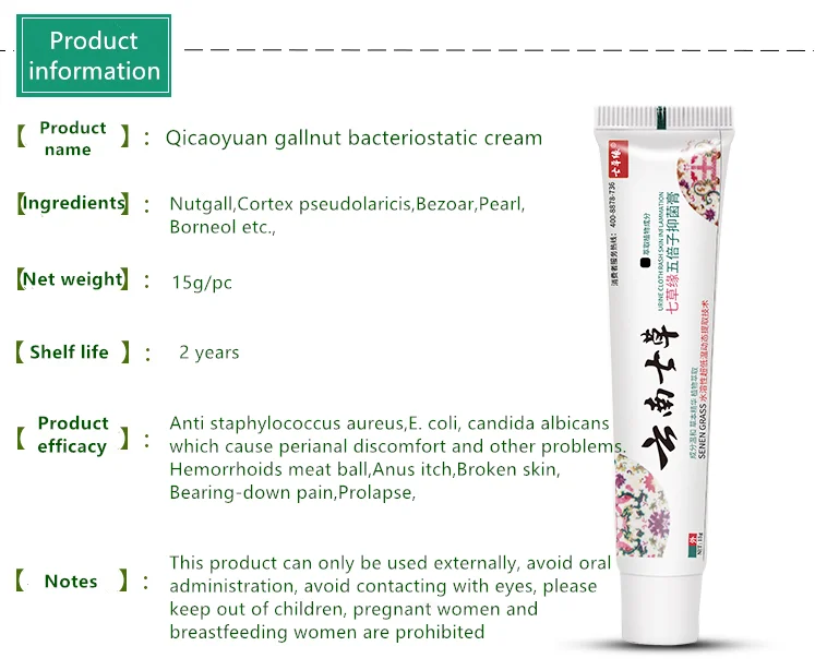 Название продукта: Qicaoyuan галлорех бактериостатический крем Основные ингредиенты: Nutgall,Cortex pseudolaricis,Bezoar,Pearl,Borneol и т. Д. Вес нетто: 15 г/шт. Срок годности: 2 года Эффективность продукта: анти-стафилококк ауреус, коли, candida albicans, которые вызывают перианальный дискомфорт и другие проблемы. Геморрой мясной шарик, анус зуд, сломанная кожа, несущая боль, пролапс, Примечания: этот продукт может использоваться только внешне, Избегайте перорального введения, Избегайте контакта с глазами, пожалуйста, держите подальше от детей, беременных женщин и кормящих женщин следует использовать с осторожностью Использование Внутренний геморрой: Используйте Бесплатный толкатель или ватный тампон, чтобы вдавить 1-2 г в анус два раза в день, один раз утром и один раз вечером Наружный геморрой: надевайте бесплатные Одноразовые Медицинские гигиенические перчатки и принимайте соответствующее количество мази равномерно смазывайте На анальные мячи, один раз утром и один раз вечером