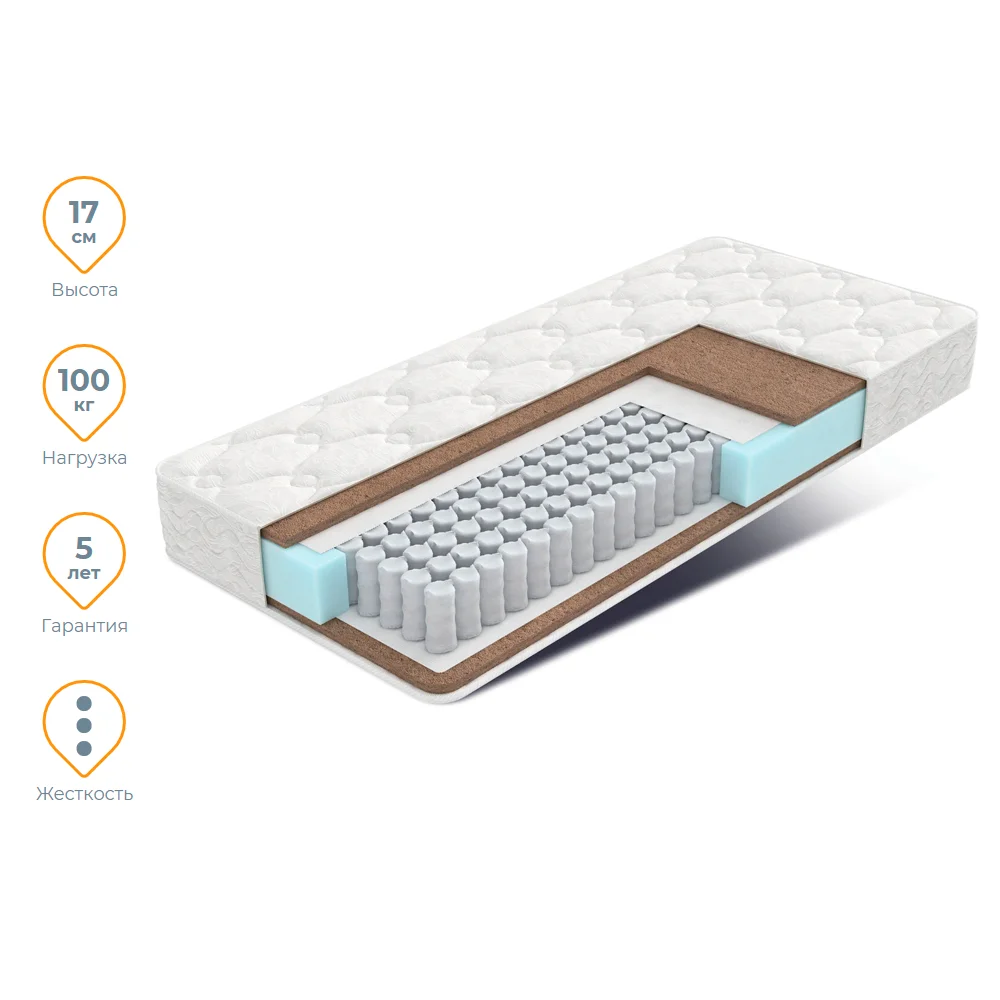 В качестве комфортного слоя выступает латексированная кокосовая койра — жесткий, долговечный, натуральный, упругий материал.
