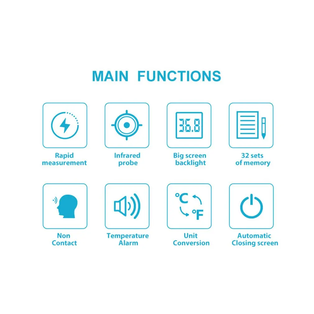 1. Точное измерение: продукт придерживается оптического принципа, точность измерения контролируется на ± 0,2 ℃. 2. Простота в эксплуатации: устройство поддерживает измерение температуры одной кнопкой. 3. Удобное чтение: устройство использует режим чтения цифрового дисплея и поддерживает подсветку. 4. Высокие показатели безопасности: продукт поддерживает бесконтактные измерения, что значительно повышает безопасность. 5. Настройки коррекции: функция F1 - Unit seting-F1 (по умолчанию фабрика-градус Цельсия) Настройка переключателя звука F2-подсказка (заводской звук подсказки по умолчанию включен) F3. Предупреждение о высокой температуре setting-F3 (фабрика ℃ 37,5) F4-Настройка подсветки (заводская настройка по умолчанию ВКЛ) F5-Настройка выхода, когда в состоянии F1/F2/F3/F4, нажмите и удерживайте кнопку настройки (настройка) в течение 3 секунд, чтобы автоматически выйти из настройки.