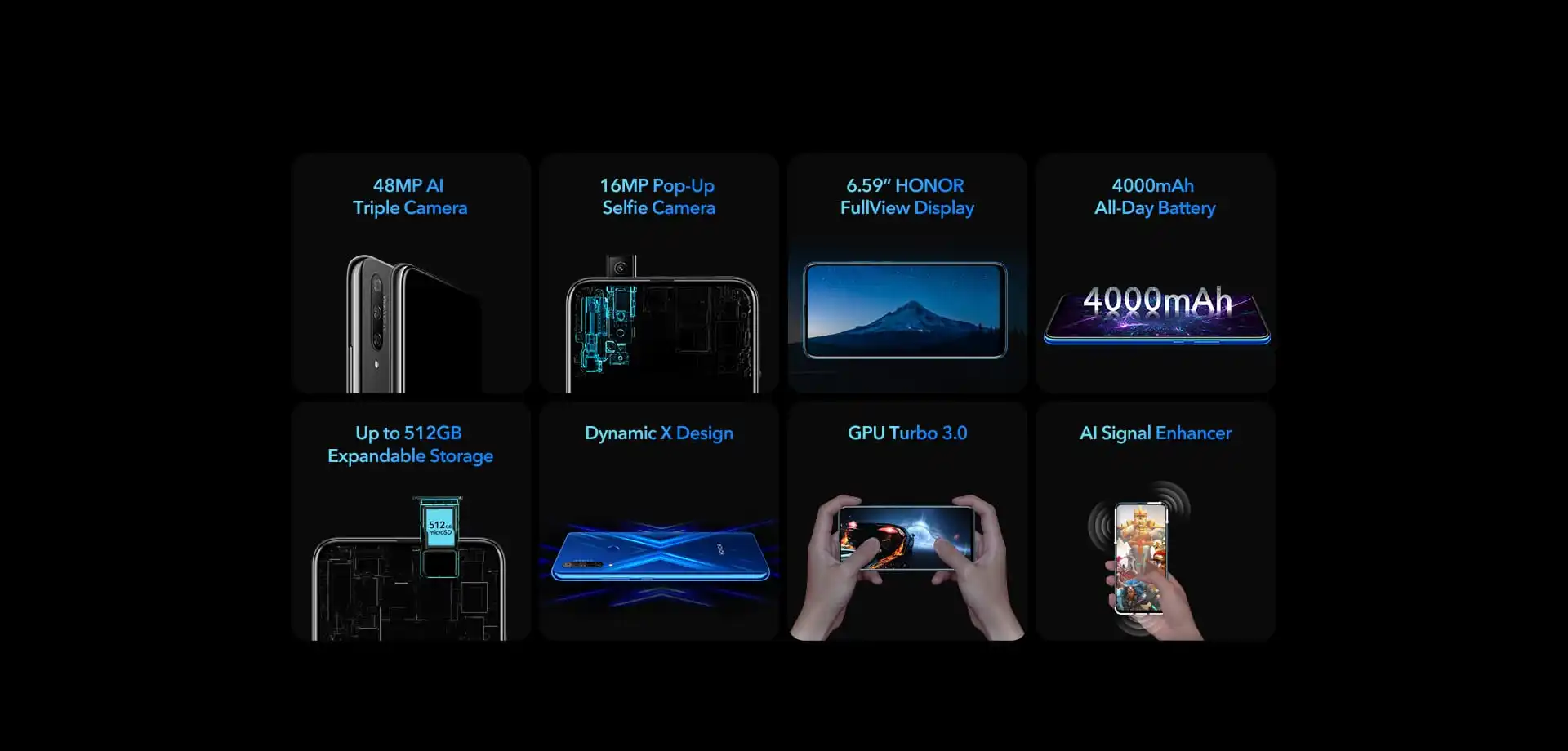 Модель Honor 9X Процессор Hisilicon Kirin 710F Поддержка NFC Камера Версия NFC: передняя 16MP, задняя (48MP + 2MP) Дисплей 6,59 дюймов, 1080*2340 Аккумулятор 4000 мАч ОС EMUI 9,1 (совместим с Android 9) Память 4 + 128 Гб/6 + 128 ГБ Сеть 4G LTE TDD: B38/B40/B41(2545-2655 МГц) 4G LTE FDD: B1/B3/B7/B8/B20 3g UMTS: B1/B2/B5/B8 2G GSM: B2/B3/B5/B8