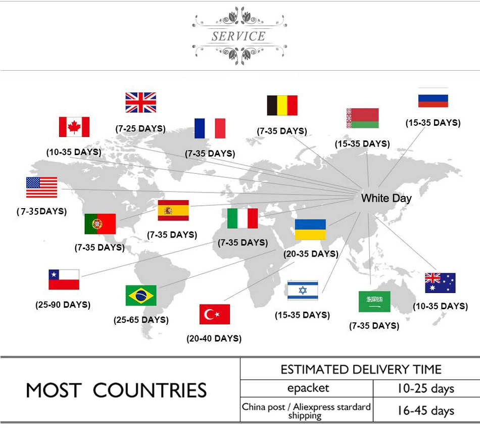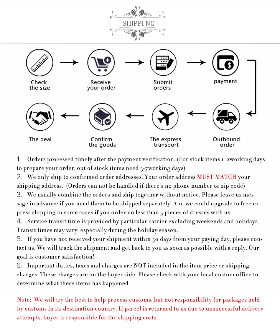 1. Время доставки Мы отправим Ваш заказ в течение 1-2 дней после подтверждения оплаты. Мы не обрабатываем ваш заказ в воскресенье или праздничные дни. Пожалуйста, позвольте дополнительно 1-2 рабочих дня для заказов на выходные. Большинство отправленных упаковок доставляются в течение 3-5 рабочих дней со дня их отправки. 2. Получение заказа Пожалуйста, не подписывайте посылка, пока не будете тщательно проверять все товары. В чехол на посылка была повреждена, очевидно, прибытию, пожалуйста отказывает пакет и немедленно свяжитесь с нами. Пожалуйста, обратите внимание, что мы не принимаем возврат посылка, не связавшись с нами. Кроме того, buye несет ответственность за оплату таможенной пошлины или налога на импорт. 3. Гарантия качества Наш отдел контроля качества тщательно проверит качество каждого товара перед упаковкой и отправкой. Мы гарантируем, что наша продукция будет наивысшего качества. Все платья хорошо упакованы в мешки от пыли. Пожалуйста, обратите внимание, что небольшая разница в размере и разница в цвете не являются проблемой качества. 4. Доставка по всему миру Мы можем отправить товары практически на любой адрес в мире. Тем не менее, вопросы гарантии, ограничения производителя или таможенные законы не позволяют нам доставлять определенные продукты в определенные географические места. Мы осуществляем доставку по всему миру, в основном из Соединенных Штатов, Великобритании, Франции, Канады, Австралии, Италии, Ирландия, Японии, Китая. Пожалуйста, сначала свяжитесь с нами, если вы не из этих стран. (например, Южной Африки, Южной Америки, Исландии, Чехии, Южной Азии и т. Д.). Мы также предлагаем страхование доставки бесплатно, чтобы защитить вашу посылка от любых утерянных или поврежденных отправлений. По любым недостающим вопросам, мы немедленно отправим Ваш заказ. 5. Отзывы Для нас клиент всегда король. Ваши отзывы очень весят для нас. Пожалуйста, оставьте нам положительный отзывы, если вам нравится наша продукция. Мы всегда совершенствуем наши услуги. Пожалуйста, примите во внимание нас и не оставляйте нам негативные отзывы, свяжитесь с нами, если возникнут какие-либо проблемы. Спасибо :) Пожалуйста, обратите внимание: пожалуйста, внимательно прочитайте эти условия и свяжитесь с нами, если у вас есть какие-либо вопросы. Получая доступ к нашим товарам или покупая их, вы соглашаетесь с этими условиями и нашей политикой конфиденциальности.
