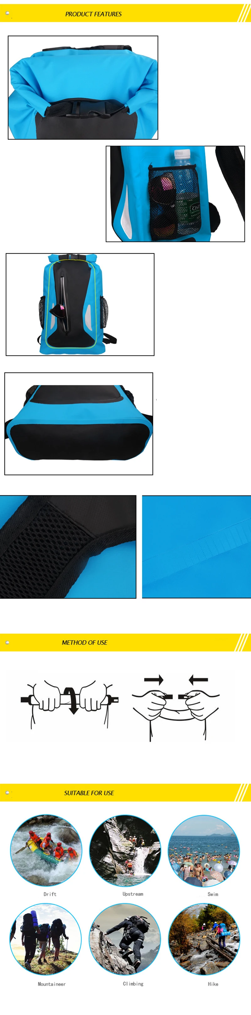 25L отражающий плавающий рюкзак, треккинг, топ, рюкзак, мотоциклетная сухая сумка, drysack ocean pack, парус, каяк, drypak deck bag Особенности продукта: 1. Профессиональный дизайн сухих сумок 2. Толстая подошва, износостойкая и водонепроницаемая 3. Водонепроницаемая пляжная сумка большой емкости 4. Полиэстер + уплотненная ПВХ ткань сетка водонепроницаемый зажим сетка материал 5. Высокое качество пряжки дизайн. Портативный и прочный 6. Подходит для плавания, пляжа, плавания, альпинизма, путешествий, каякинга, походов и кемпинга Характеристики: Материал: ПВХ Емкость: 25 л Посылка включает в себя: 1 водонепроницаемый мешок для сушки