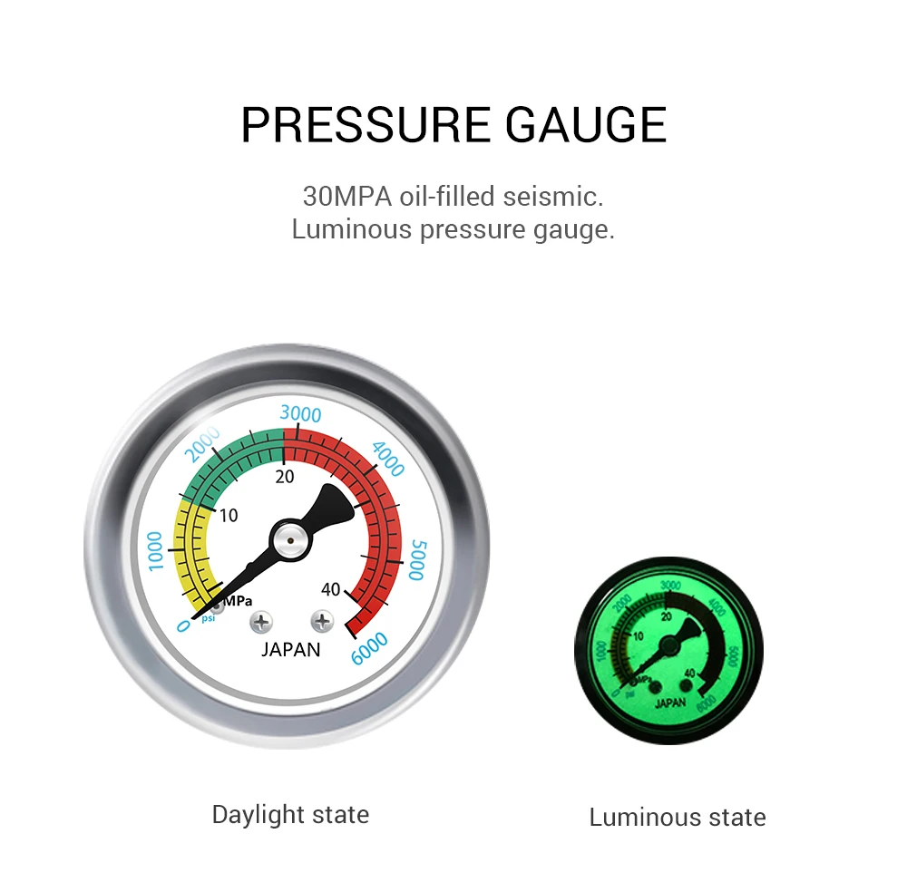 Пожалуйста, обратите внимание, что когда указатель манометра кислородного цилиндра достигает 3000psi/20 бар (красная индикаторная линия), акваланг заполнен. Пожалуйста, прекратите накачивать