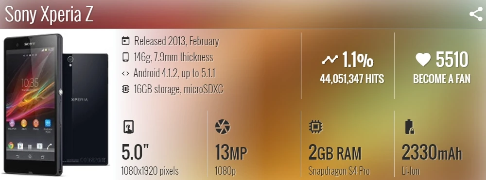 Сетевая технология GSM / HSPA / LTE 2G полосы GSM 850 / 900 / 1800 / 1900 - C6602, C6603 3G полосы HSDPA 850 / 900 / 2100 - C6603 HSDPA 850 / 900 / 1700 / 1900 / 2100 - C6602 Полосы 4G LTE 1(2100), 3(1800), 5(850), 7(2600), 8(900), 20(800) - C6603 Скорость HSPA 42,2/5,76 Мбит/с, LTE Cat3 100/50 Мбит/с GPRS до 107 кбит/с EDGE до 296 kbps Запуск анонсирован 2013, январь Статус Доступен. Выпущено 2013, февраль Размеры корпуса 139x71x7,9 мм (5,47x2,80x0,31 дюйма) Вес 146 г (5,15 унции) Сборка переднего/заднего стекла, пластиковая рамка SIM Micro-SIM Защита от пыли и воды IP57 Водонепроницаемость до 1 метра и 30 минут Тип дисплея TFT емкостный сенсорный экран, 16M цветов РАЗМЕР 5,0 дюйма, 68,9 см2 (соотношение экрана к корпусу ~ 69.8%) Разрешение 1080x1920 пикселей, соотношение 16:9 (плотность ~ 441 ppi) Защитное небьющееся стекло Платформа ОС Android 4.1.2 (Jelly Bean), возможность обновления до 5.1.1 (Lollipop) Чипсет Qualcomm APQ8064 Snapdragon S4 Pro ЦП четырехъядерный 1,5 ГГц GPU Adreno 320 Слот для карты памяти microSD, до 64 Гб (специальный слот) Внутренний 16 ГБ, 2 Гб RAM Основная камера Одиночная 13,1 Мп, AF, f/2,4 Особенности светодиодной вспышки, HDR Видео 1080p @ 30fps, HDR Селфи камера Одиночная 2,2 МП Видео 1080p @ 30fps Звуковой громкоговоритель да Разъем 3,5 мм да Активное шумоподавление с выделенным микрофоном COMMS WLAN Wi-Fi 802,11 a/b/g/n, двухдиапазонный, Wi-Fi Direct, DLNA, hotspot Bluetooth 4,0, A2DP GPS да, с A-GPS, ГЛОНАСС NFC да Радио Стерео fm-радио, RDS USB microUSB 2,0 (MHL TV-out), USB-хост Особенности датчиков Акселерометр, гироскоп, близость, компас Несъемный литий-ионный аккумулятор 2330 мАч В режиме ожидания до 550 ч (2G) /до 530 ч (3G) Время разговора до 11 ч (2G) /до 14 ч (3G) Воспроизведение музыки до 40 часов Разные цвета черный, белый, фиолетовый Модели C6603, C6602 SAR 1,05 Вт/кг (голова) 0,56 Вт/кг (тело) SAR EU 0,48 Вт/кг (головка) Цена около 270 EUR Тестовый коэффициент контрастности дисплея: 705:1 (номинальный)/2,462: 1 (солнечный свет) Фото/видео камеры Громкоговоритель 60 дБ/шум 58 дБ/кольцо 61 дБ Шум качества звука-81,9 дБ/Перекрестные помехи-81,3 дБ Срок службы батареи 48 часов