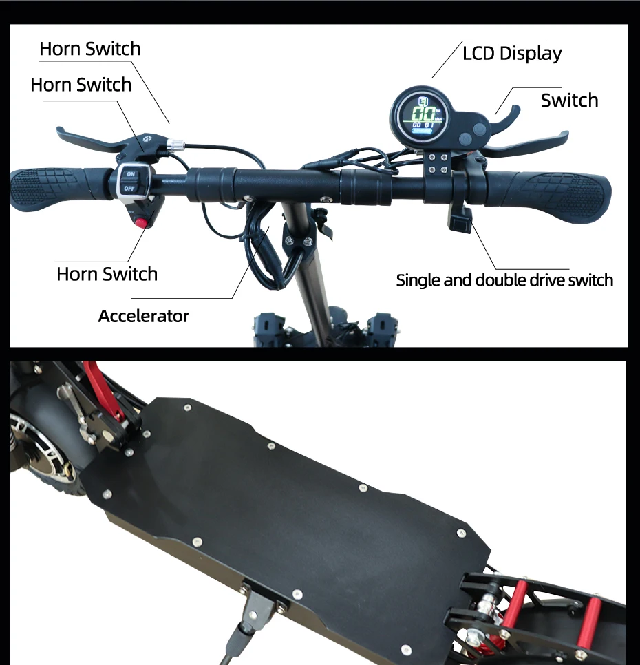 Название продукта: 11 дюймов мощный Dualdrive Электрический скутер Двигатель: 52 в 2000 Вт (передний 1000 Вт + задний 1000 Вт, бесщеточный двигатель)/ 52 в 2600 Вт (передний 1300 Вт + задний 1300 Вт, бесщеточный двигатель), бесщеточный двигатель, самый мощный) Максимальная нагрузка: 200 кг Вес нетто: 42-55 кг Размер колеса: 11 дюймовая вакуумная Взрывозащищенная шина Емкость аккумулятора: 52 в 20 Ач (Литиевый аккумулятор) Рабочее напряжение: 52 в/48 в Максимальная скорость: 55-75 км/ч Пробег (зависит от веса дороги и водителя):50-80 км Время зарядки: 6-8 часов Угол подъема: 40 градусов Светильник: передняя лампа, хвост, светильник, светильник Комплектация: электрический скутер, зарядное устройство, руководство пользователя, дистанционный ключ