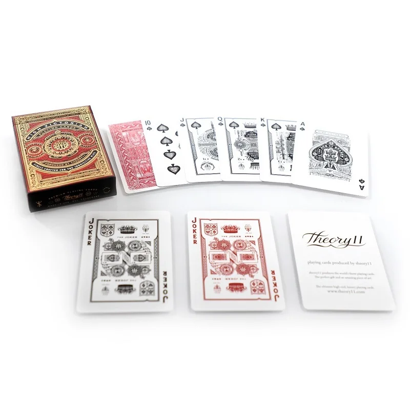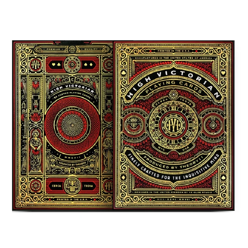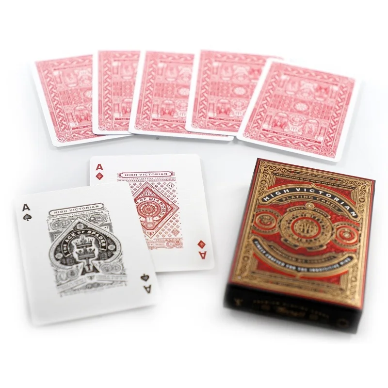 Высокие викторианские игральные карты были вдохновлены замысловатым, захватывающим дух стилем викторианской эры Каждый элемент был разработан с нуля с кропотливым, неустанным вниманием к деталям. Иллюстрированная в Лондоне Джо Уайтом, каждая игральная карта в высокой викторианской колоде была спроектирована с нуля-даже тузы, Джокеры, И придворные карточки источают огромное избыток орнамента квинтэссенции викторианской эры