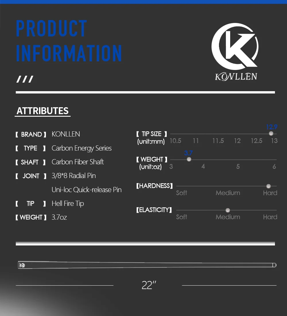 Название: KL углеродный энергетический вал Наконечник: бакелитовый наконечник Длина: 74 см Вал: стержень из углеродного волокна Соединение: 3/8*8 радиальный штыревой шарнир/Uni-Loc соединение Вес: 3,8 унций Наконечник Размеры: 12,9 мм Совет: огненный наконечник