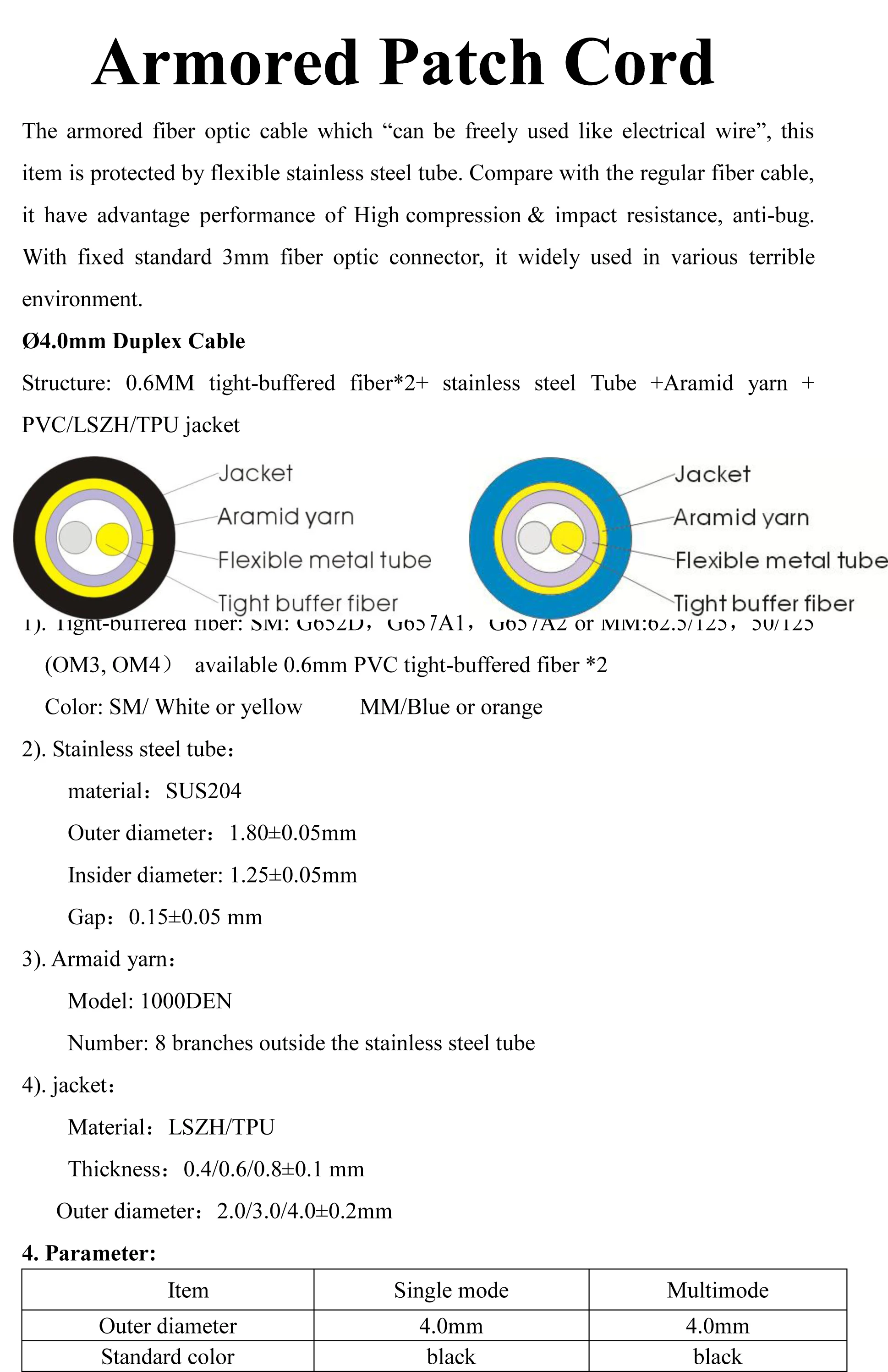 SM,2 ядра, G657A, 4,0 мм, 1 м, ODC квадратный/круглый (мужской) Женский к LC/FC ТПУ бронированный волоконно-оптический патч-корд кабель, 30 см от штепсельной вилки к LCUPC