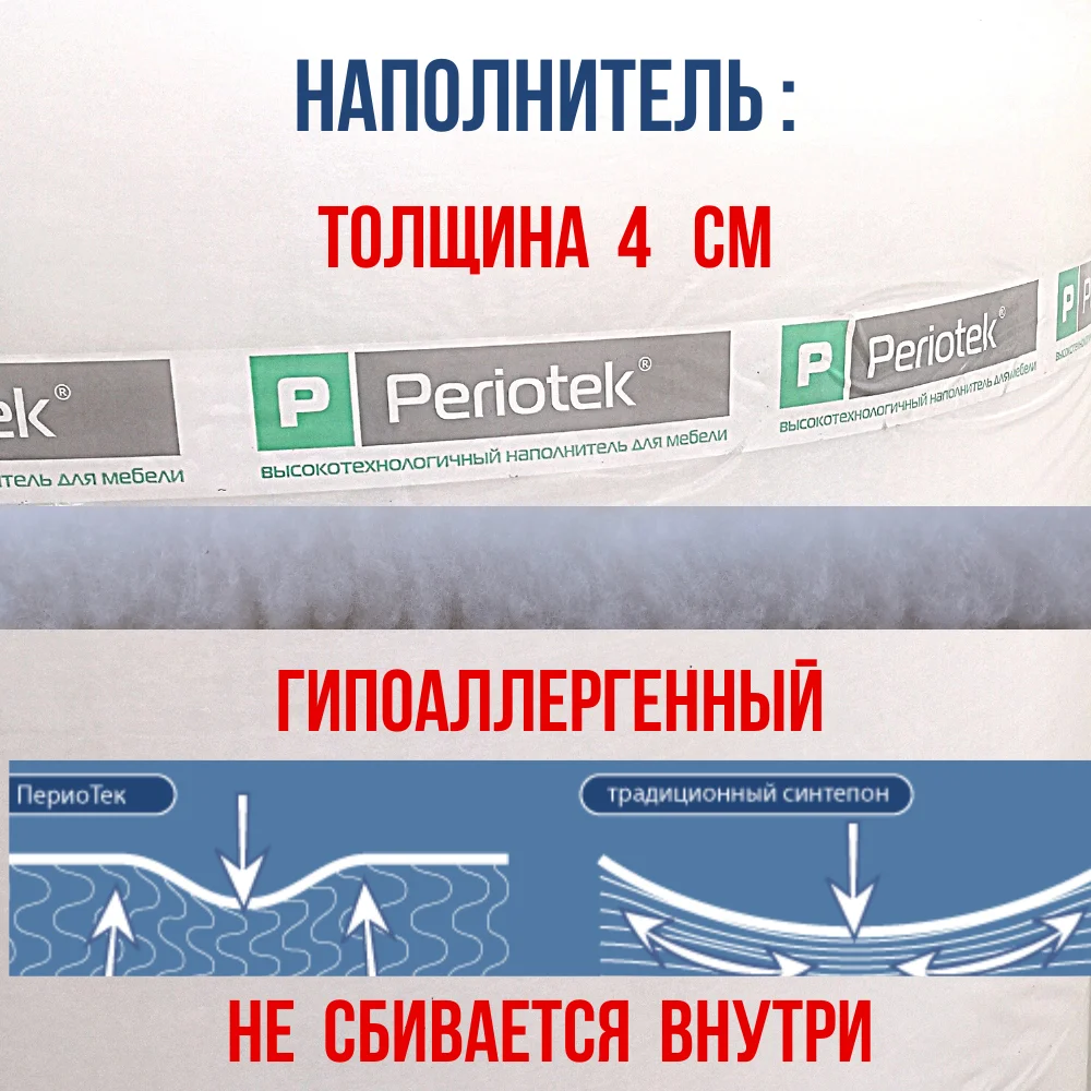 Внутри — наполнитель периотек толщиной 4 см (гипоаллергенный, сохраняет свою форму после машинной стирки, не сбивается!).