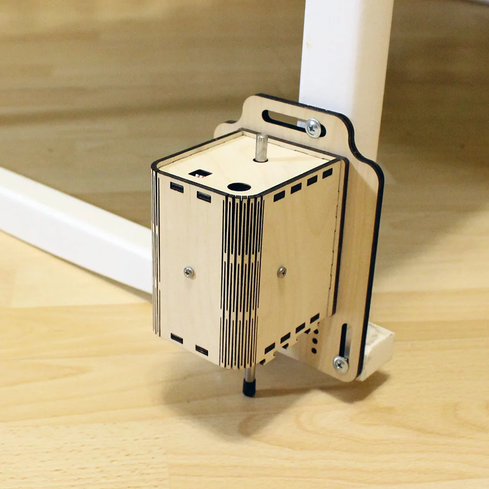 Установка устройства на кроватку заключается в закреплении его на краю дугообразного полоза с помощью прилагаемых саморезов. Порядок установки устройства на кроватку: 1. Выберите место для установки устройства максимально далеко от центра кроватки. При качании кроватки устройство не должно задевать пол частями корпуса. 2. Приложите устройство к кроватке и разметьте три отверстия для его крепления. Проверьте высоту установки. В положении равновесия шток с верхней стороны устройства должен быть выдвинут на 12..17 мм. Если это не так, открутите 4 винта на задней грани прибора и переставьте шасси на несколько отверстий вверх или вниз. 3. Сверлом диаметром 1,5..3 мм просверлите три глухих отверстия в отмеченных местах. 4. Приверните устройство к кроватке. Примечание: допускается (но не рекомендуется) приворачивать прибор саморезами без предварительного просверливания отверстий. Подробнее об установке можно прочитать в инструкции.