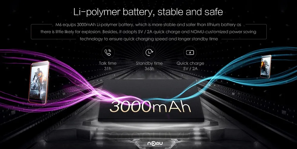NOMU M6 принимает аккумулятор 3000 мАч с быстрой зарядкой, чтобы обеспечить вам безопасное и надежное обслуживание. Для людей, которые нуждаются в деловых поездках, длительном путешествии или просто беспокоятся о длительном времени зарядки, это устройство просто подходит для вас.