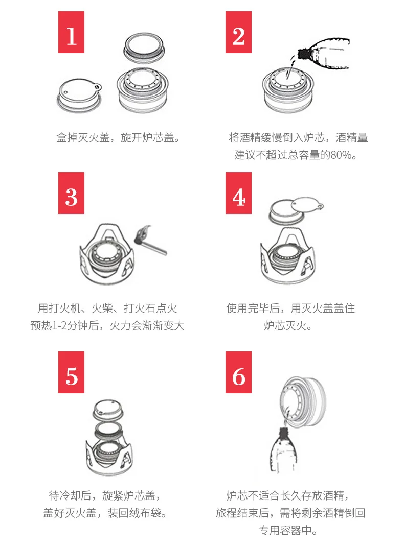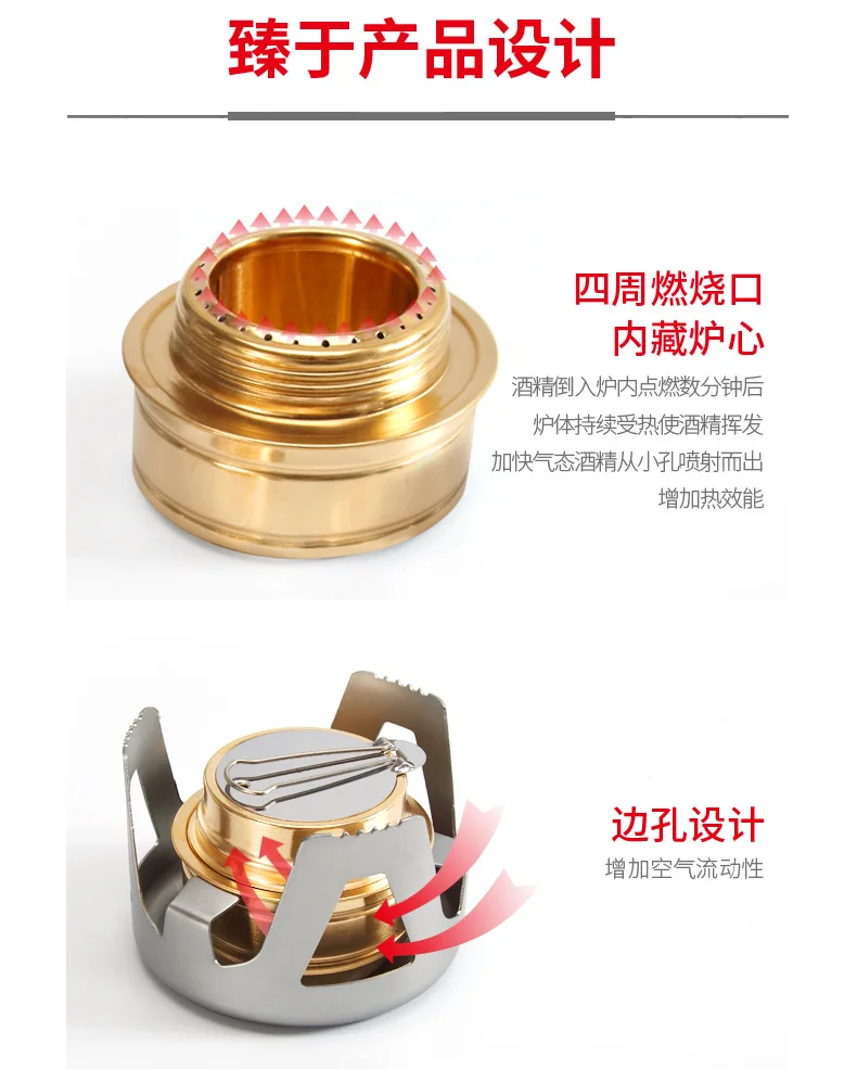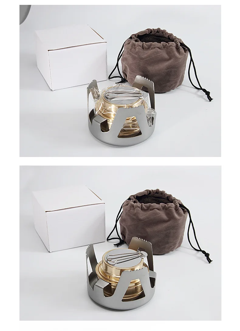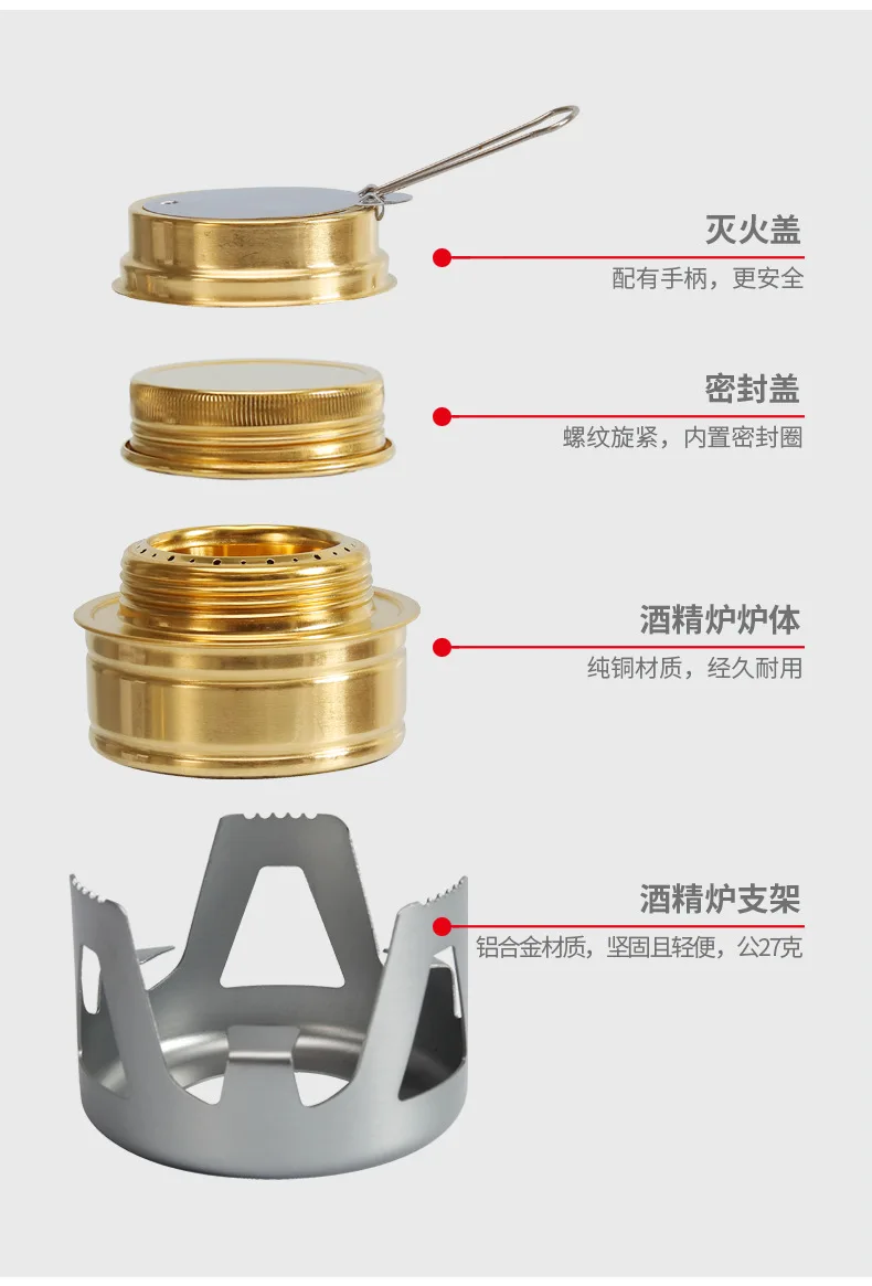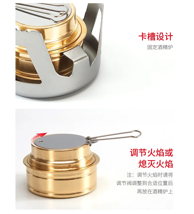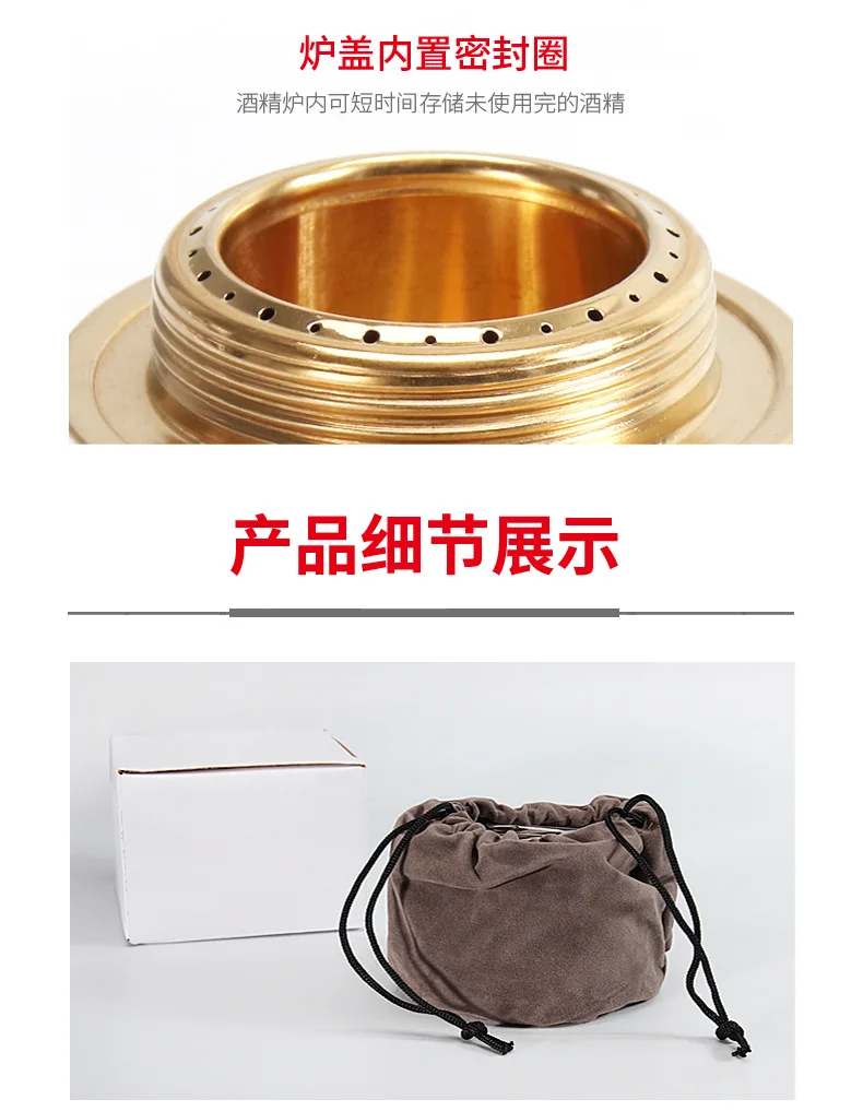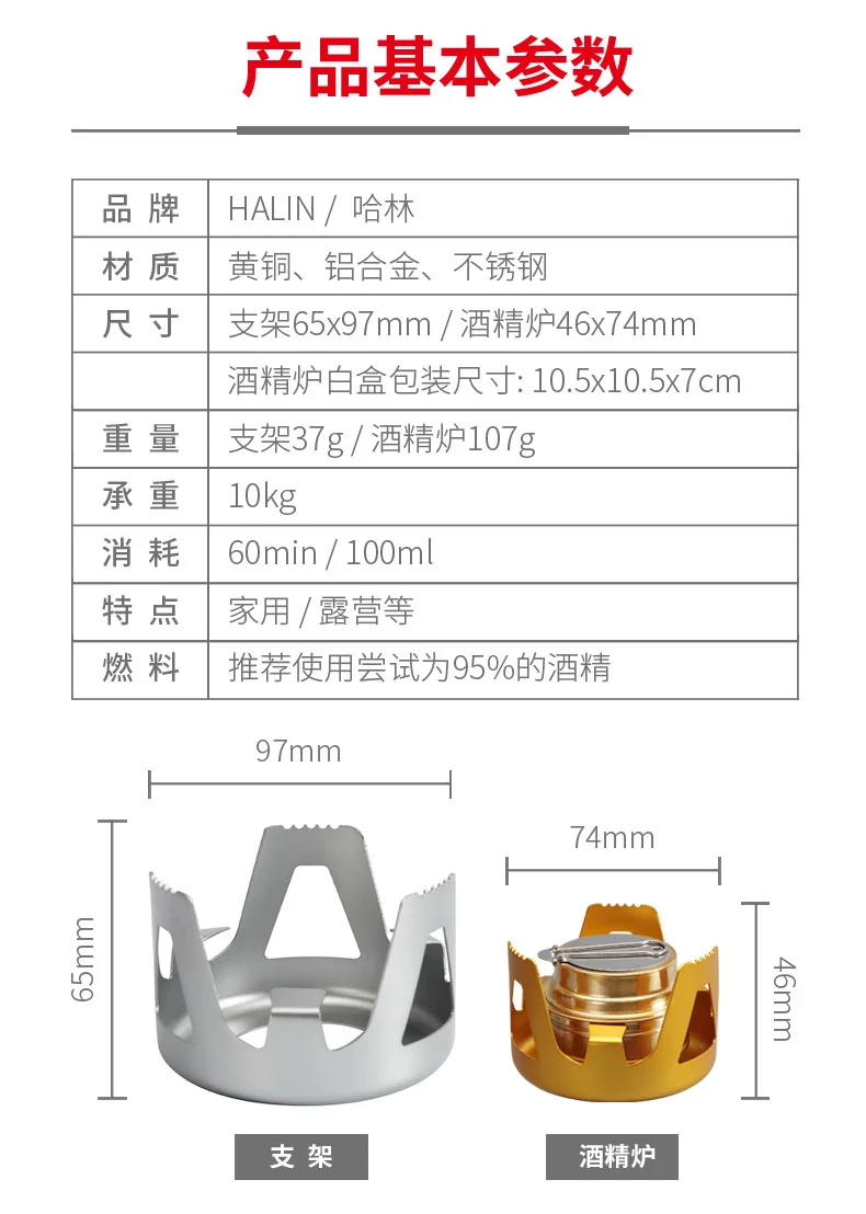 Материал: медь, нержавеющая сталь Алюминиевый сплав Размер: подставка 65*97 мм Горелка 46*74 мм Вес: 154 г Загрузка: 15 кг Топливо: 95% спирт Характеристики: Особенности: 1. Светильник весовой конструкции: портативный для использования на открытом воздухе. 2. Регулируемая мощность огня для удовлетворения ваших различных потребностей. 3. Безопасная конструкция крышки для тушения огня при готовке. 4. Ручка против ожогов: предотвращает ожогов при перемещении кастрюли. (Пожалуйста, переместите горшок после того, как пожар погаснет) 5. Для удобного использования и очистки. Посылка включает в себя: 1 спиртовая плита, 1 Подставка для печи, 1 сумка для переноски