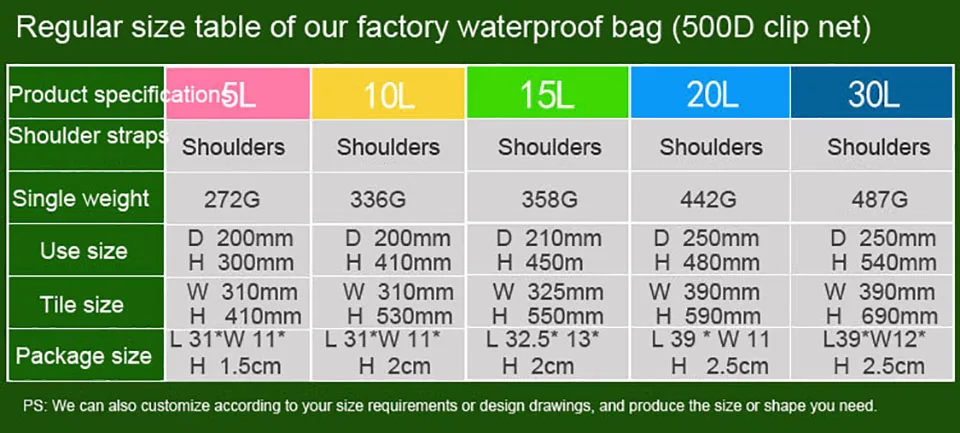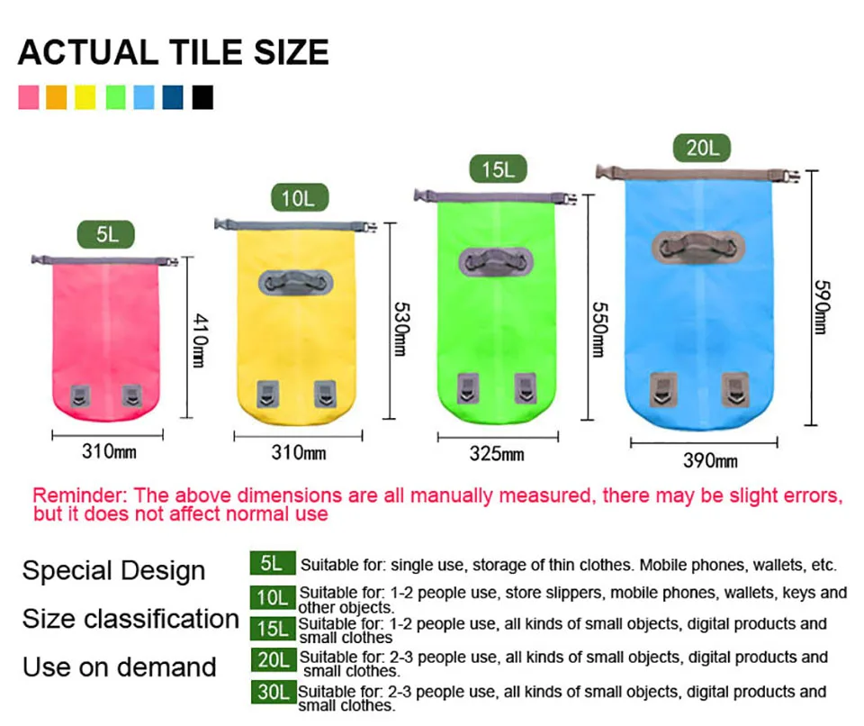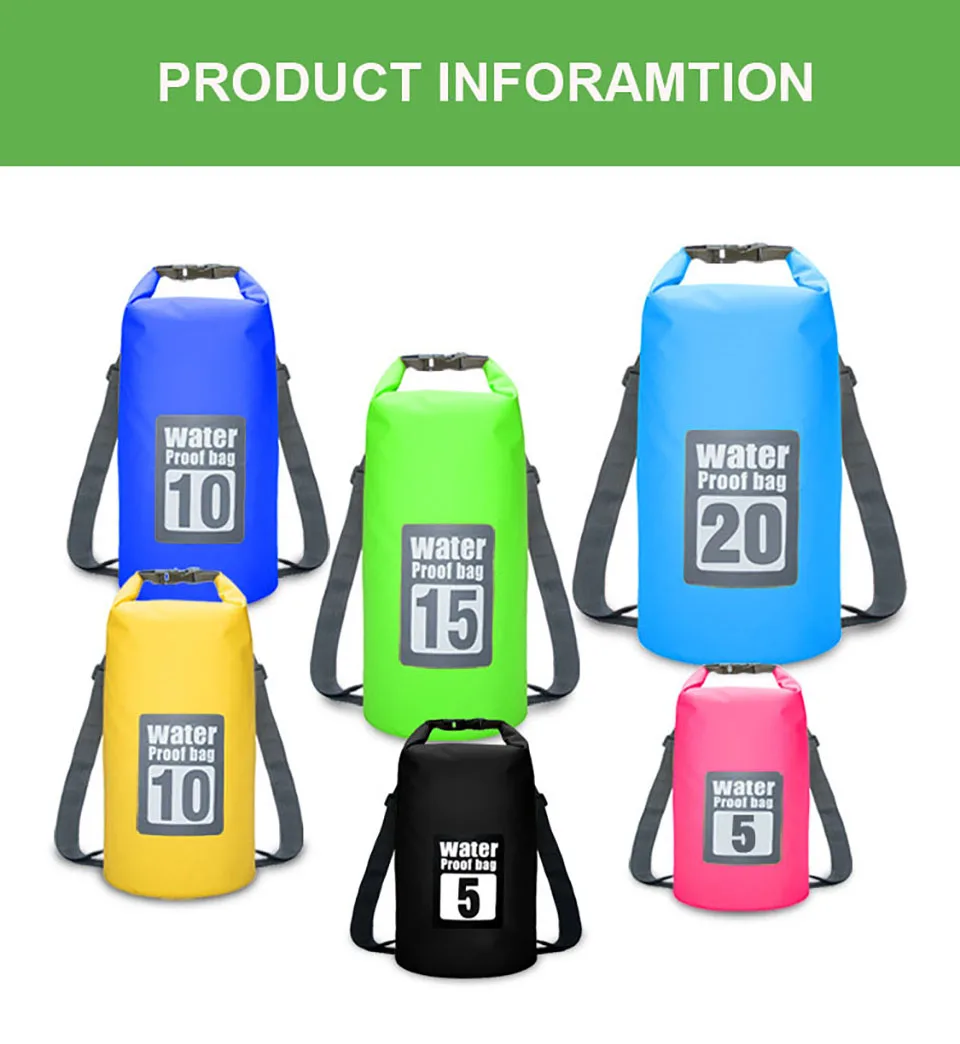 Характеристики: Название: портативная водонепроницаемая сумка-мешок через плечо Литр: 5л, 10л, 15л, 20л, 30л Материал: импортная сетчатая ткань из ПВХ Размер: см. Значок измерения ниже Особенности: высокая прочность, сильная водонепроницаемость, простота использования и влагостойкость Применение: рафтинг/плавание/Потоковое вещание/Туризм на открытом воздухе и т. д. Цвет: розовый, оранжевый, желтый, зеленый, синий, темно-синий, черный Комплектация: 1 водонепроницаемая сумка-мешок
