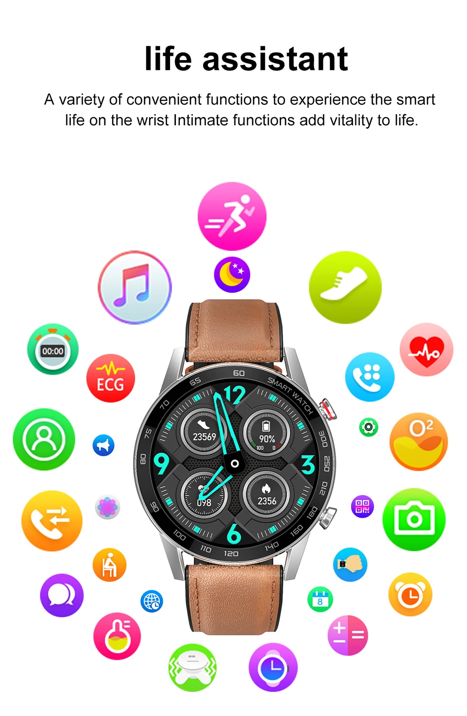 * Основные характеристики: пульс, ЭКГ, кровяное давление/кислород, шагомер, секундомер, управление музыкой, Bluetooth камера,