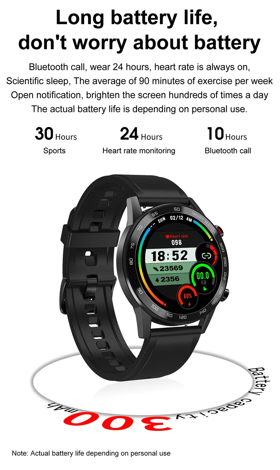 Вызов по Bluetooth, ношение 24 часов, пульс всегда включен, научный сон, в среднем 90 минут упражнений в неделю, открытое уведомление, осветляет экран сотни раз в день