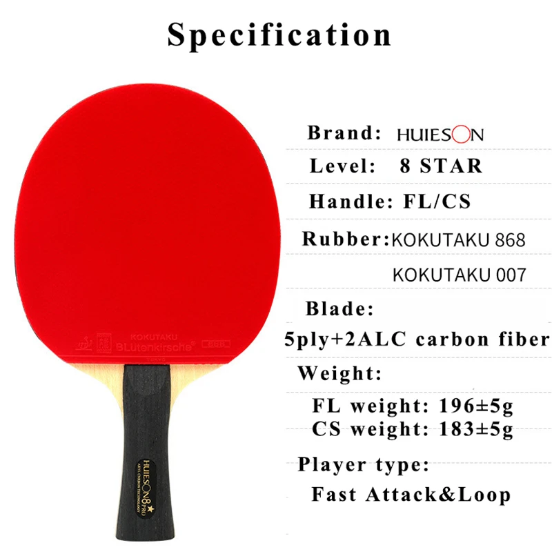 Huieson 8 Звездные ракетки для настольного тенниса профессиональная ракетка для пинг понга синяя арилатная весла из углеродного волокна для пинг понга легкий Спецификация: Бренд: HUIESON Модель: 8 со звездами в синем, ALC углеродное волокно ракетка для настольного тенниса Ручка: CS (короткая ручка) / FL (длинная ручка) Структура лезвия: Koto + blue ALC + Ayous + Paulownia + Ayous + blue ALC + Koto Резина: Переда kokutaku 868 Задняя сторона kokutaku 007 Вес: FL 196 ± 5g прибл.; CS 183 ± 5g прибл. Ракетка для настольного Толщина: 13,4 ± 0,2 мм Толщина лезвия: 6,7 ± 0,2 мм Подходит для: профессионального и продвинутого Характеристики: соревновательная ракетка для настольного тенниса уровня 8 в сочетании с pro blue arylate blade из углеродного волокна и kokutaku sticky tension rubber. Специально разработан для быстрого атаковать и циклического управления плеером. Упаковочный лист: 1*8 Звезда ракетка для настольного тенниса 1 * сумка