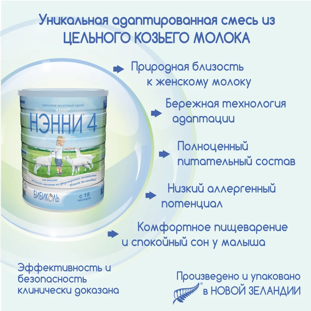 Для нормального роста и развития детей очень важно сбалансированное питание, особенно в период до 3-х лет, когда закладываются основы здоровья. С возрастом ребенка меняются его вкусовые предпочтения, он знакомится с новыми продуктами, и не всегда еда «с общего стола» имеет необходимый малышу баланс питательных веществ, витаминов и минералов. Молочный напиток «НЭННИ 4» создан из натурального цельного козьего молока для дополнительного сбалансированного питания детей старше 1,5 лет.