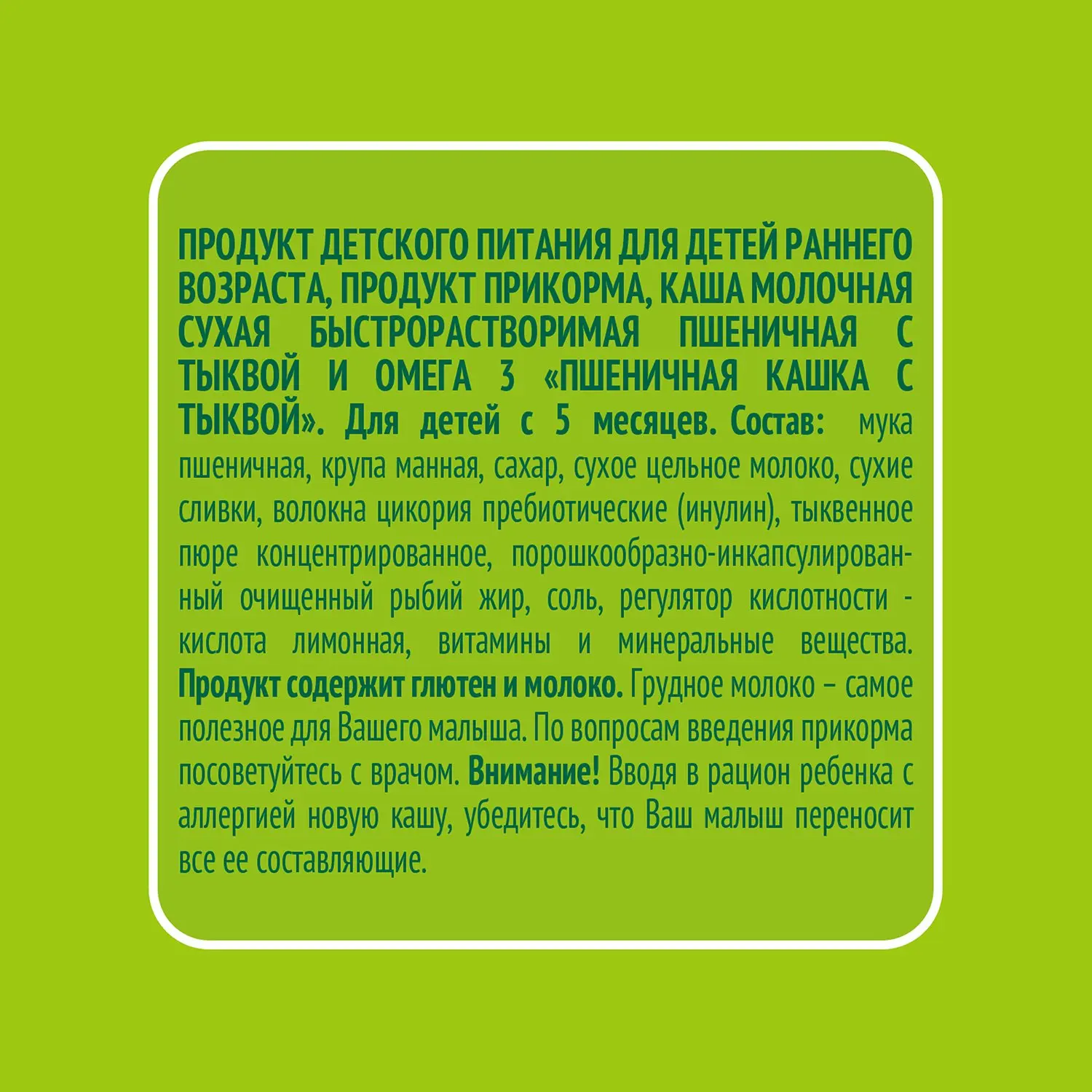 Детское питание создается с заботой о самых маленьких, поэтому в составе пшеничных тыквенных каш нет консервантов, красителей, усилителей вкус и пальмового масла, а злаки бережно обрабатываются паром для сохранения полезных свойств.