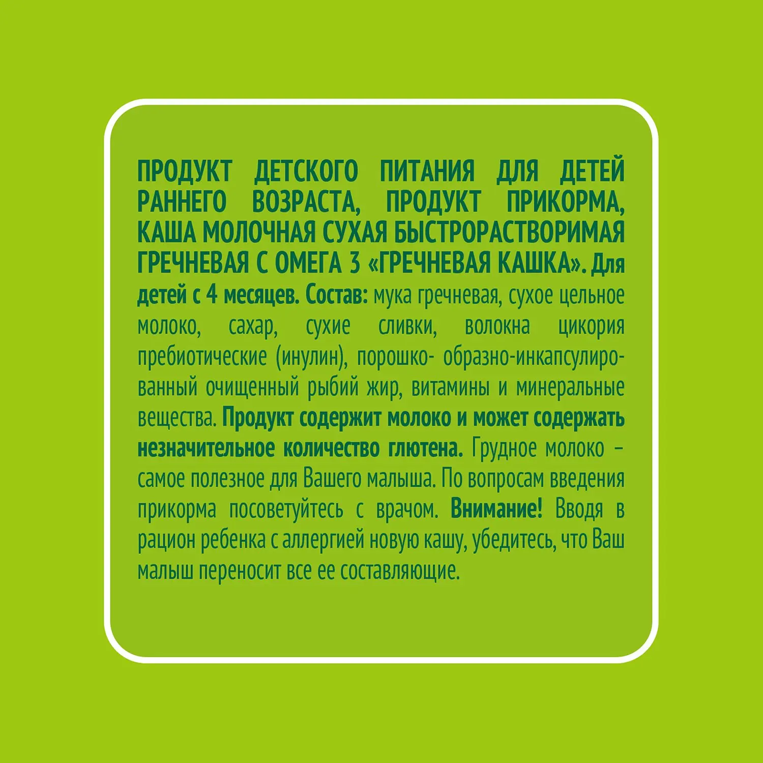 Гречневую кашу рекомендуется употреблять для профилактики железодефицитной анемии. Продукт дополнительно обогащен пребиотиками растительного происхождения. Пребиотики стимулируют рост полезной микрофлоры кишечника и способствуют здоровому пищеварению малыша.