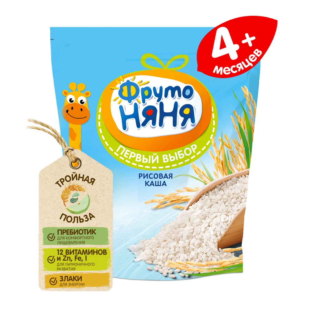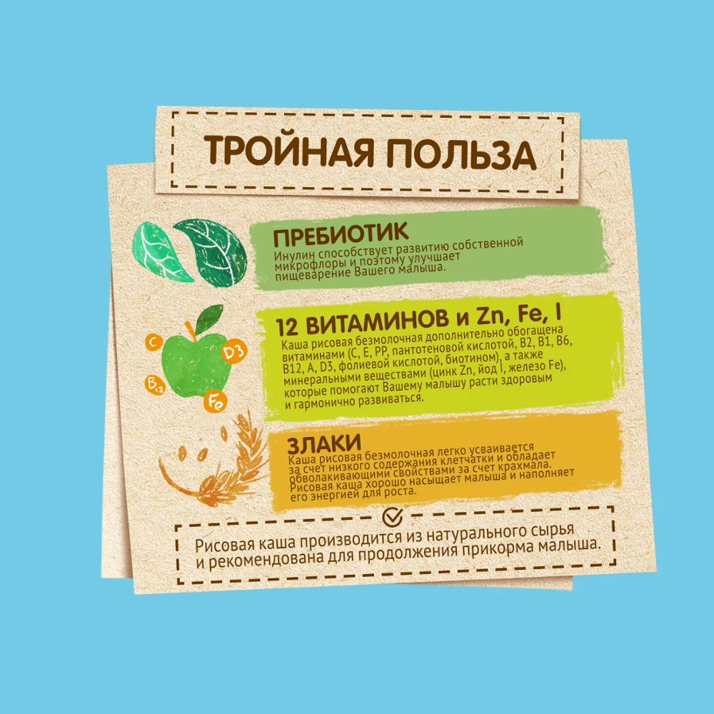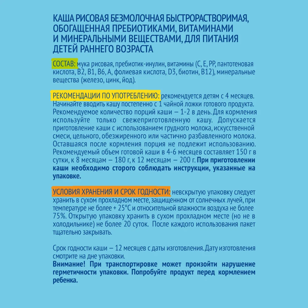 Каша рисовая безмолочная быстрорастворимая, обогащённая пребиотиками, витаминами и минеральными веществами, для питания детей раннего возраста.