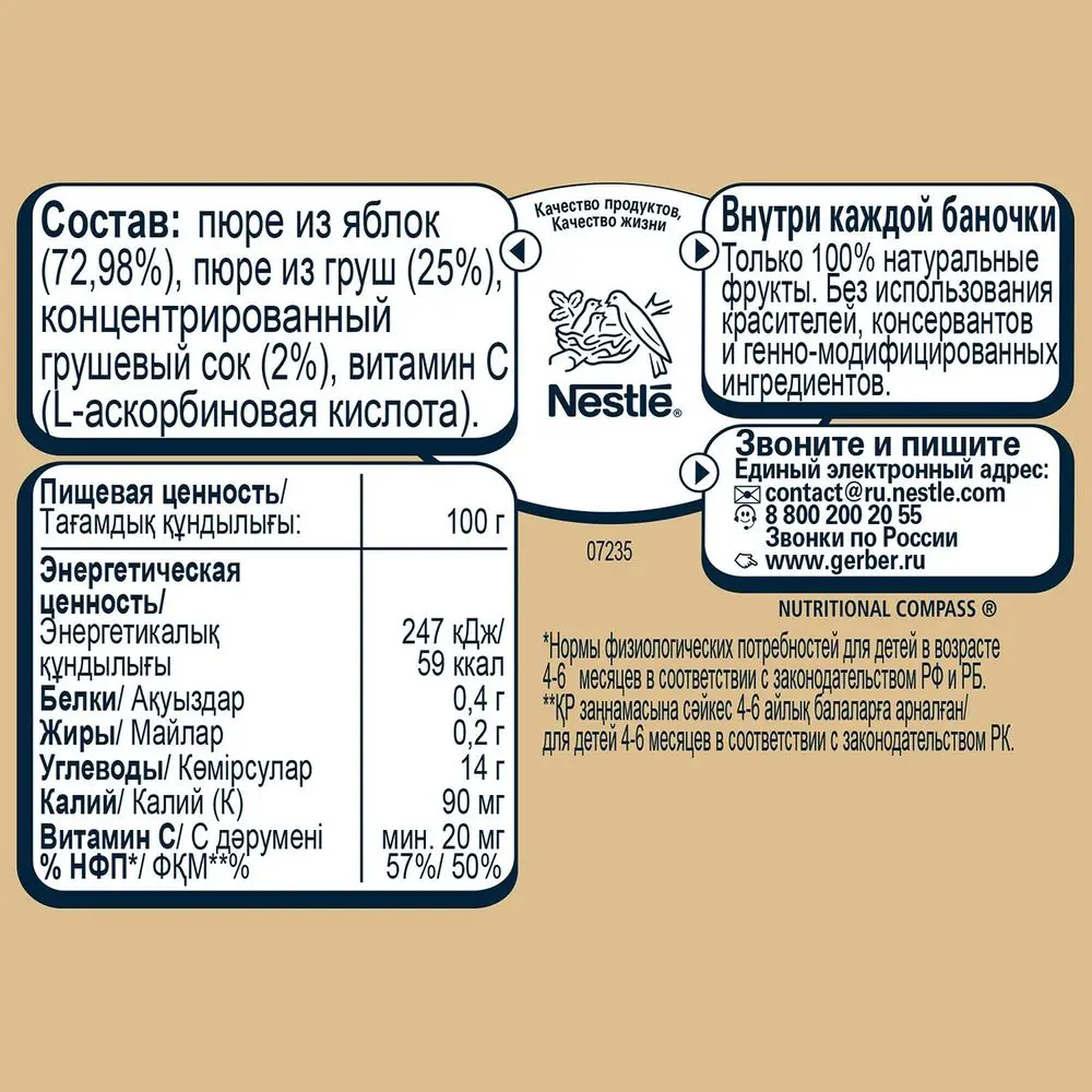 Gerber (Гербер) Фруктовое пюре из яблока и груши 130 г. для питания детей старше 5 месяцев согласно законодательству РФ.