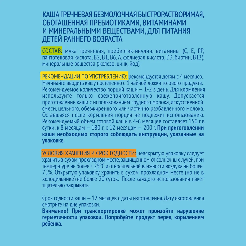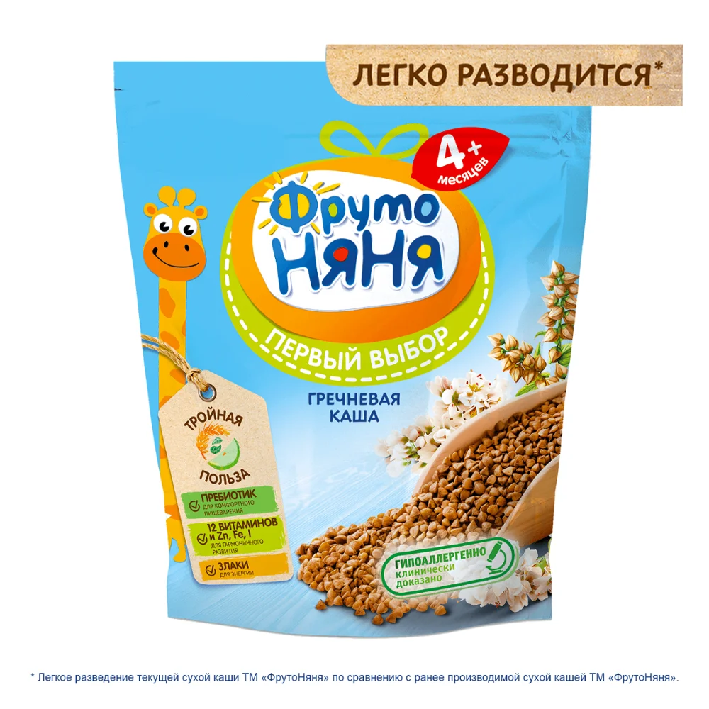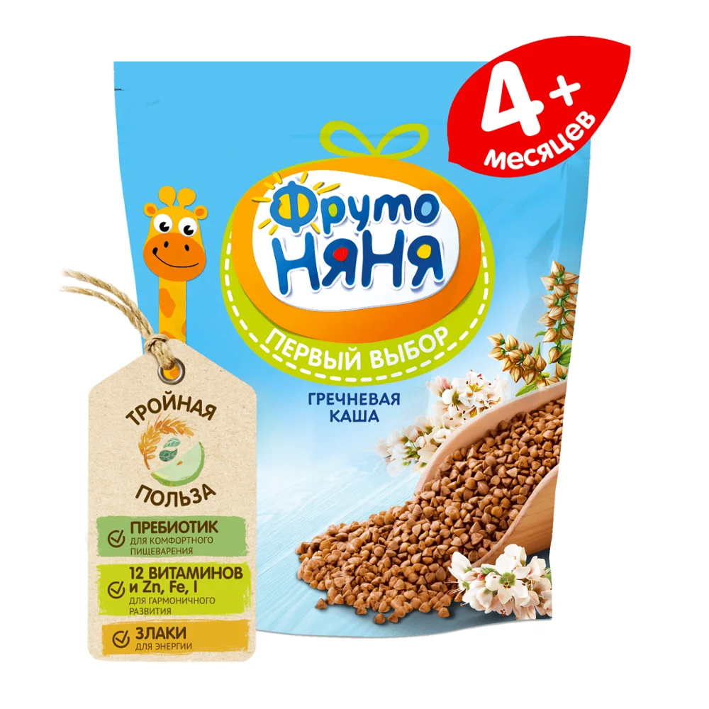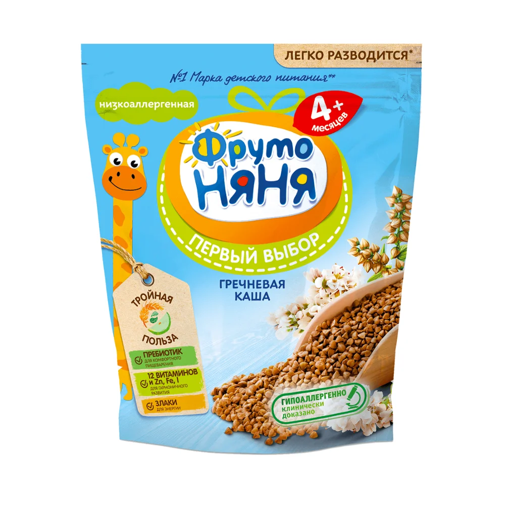 Каша гречневая безмолочная быстрорастворимая, обогащённая пребиотиками, витаминами и минеральными веществами, для питания детей раннего возраста.