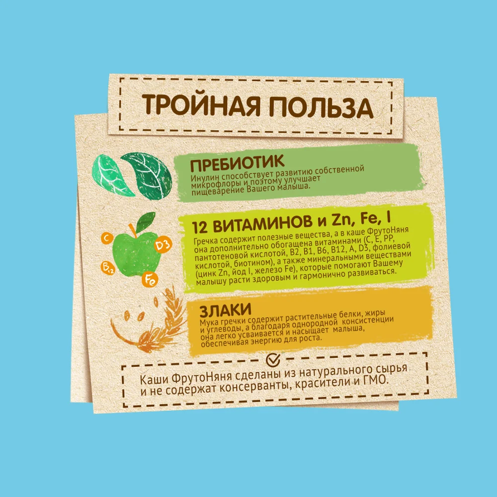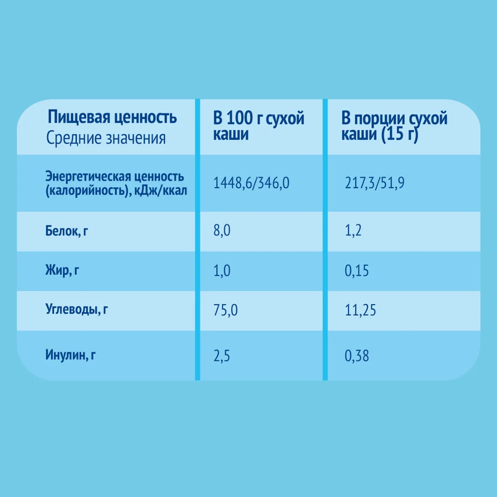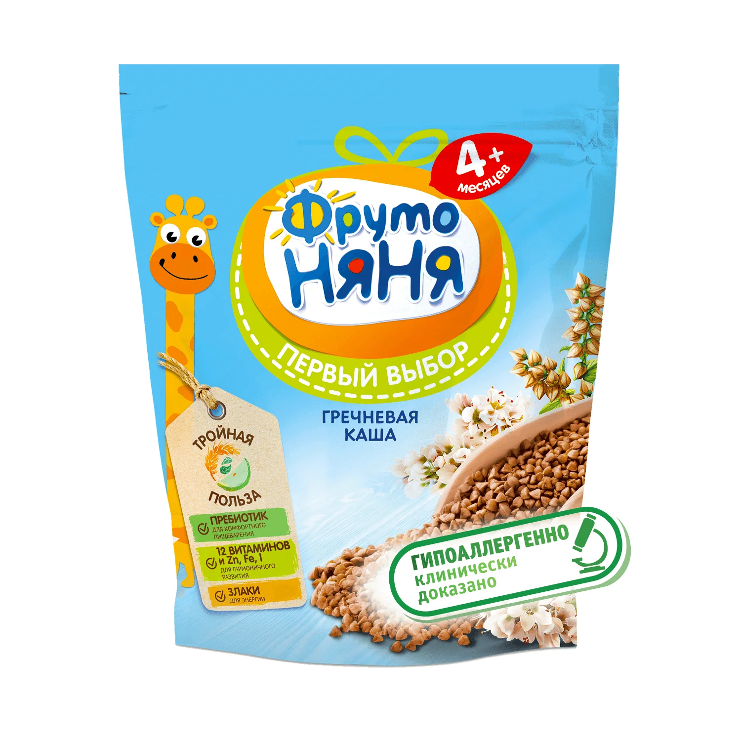 Каша гречневая безмолочная быстрорастворимая, обогащённая пребиотиками, витаминами и минеральными веществами, для питания детей раннего возраста.