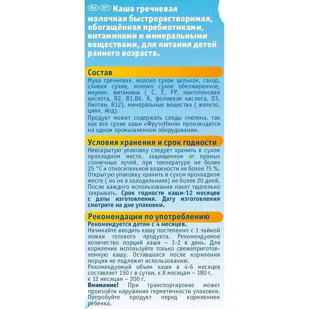 ФрутоНяня каша гречневая молочная быстрорастворимая, обогащённая пребиотиками, витаминами и минеральными веществами, для питания детей раннего возраста.