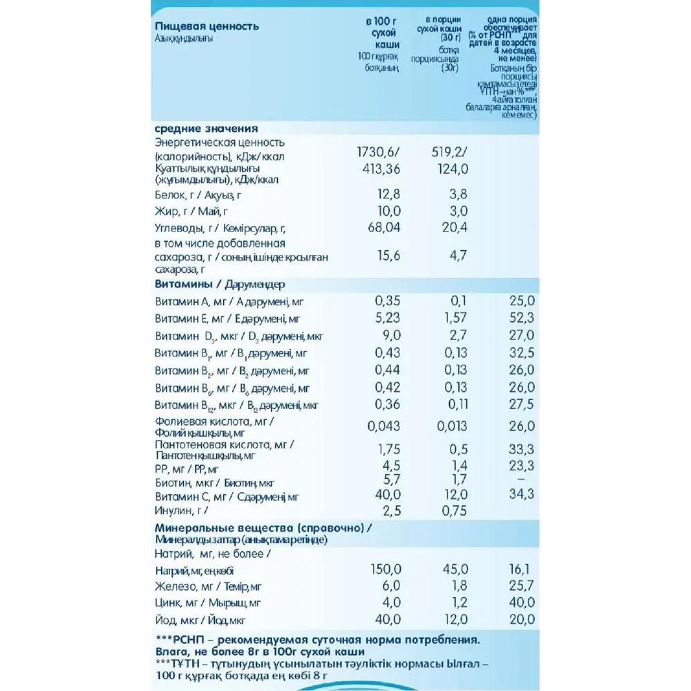 Рекомендации по употреблению: Начинайте вводить кашу постепенно с 1 чайной ложки готового продукта. Рекомендуемое количество порций каши – 1-2 в день. Для кормления используйте только свежеприготовленную кашу. Оставшаяся после кормления порция не подлежит использованию. Рекомендуемый суточный объем готовой каши составляет 150 г в сутки, к 8 месяцам - 180 г, к 12 месяцам - 200 г.