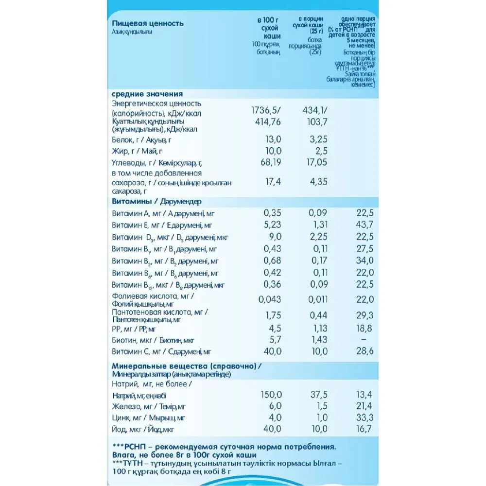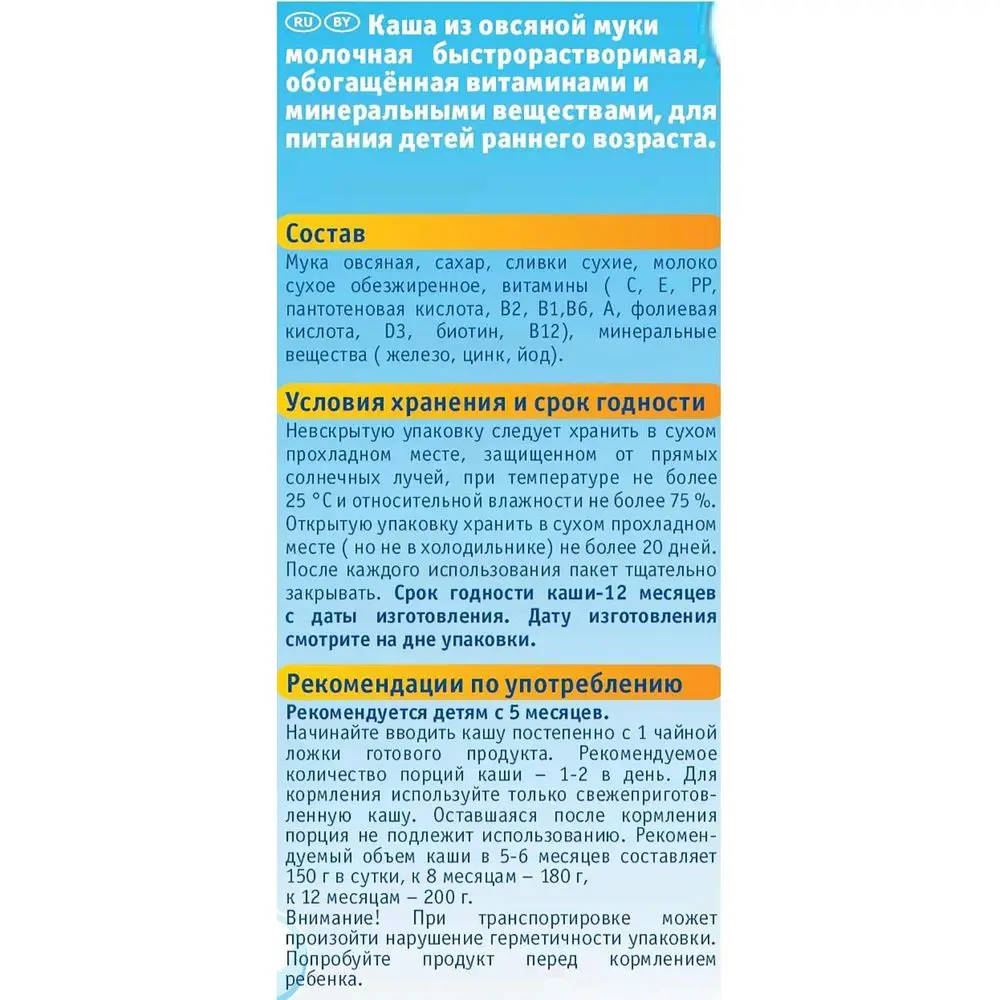 Рекомендации по употреблению: рекомендуется детям с 5 месяцев. Начинайте вводить кашу постепенно с 1 чайной ложки готового продукта. Рекомендуемое количество порций каши – 1-2 в день. Для кормления используйте только свежеприготовленную кашу. Оставшаяся после кормления порция не подлежит использованию. Рекомендуемый суточный объем готовой каши к 5-6 месяцам составляет 150 г в сутки, к 8 месяцам - 180 г, к 12 месяцам - 200 г.
