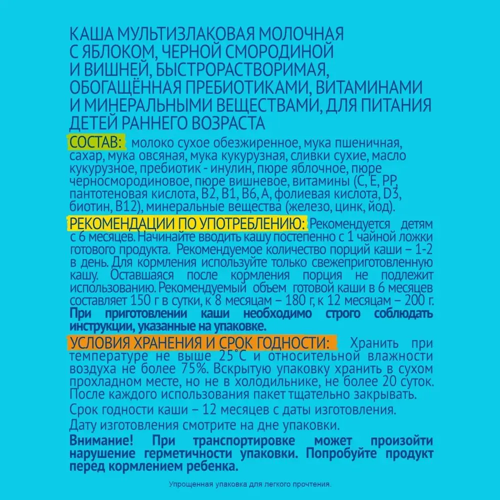Молоко сухое обезжиренное, мука пшеничная, мука кукурузная, сахар, масло кукурузное, мука овсяная, пюре яблочное концентрированное, пюре черной смородины, пюре вишневое, витамины (С, Е, РР, пантотеновая кислота, В2, В1, В6, А, фолиевая кислота, D3, биотин, В12), минеральные вещества (железо, цинк, йод)