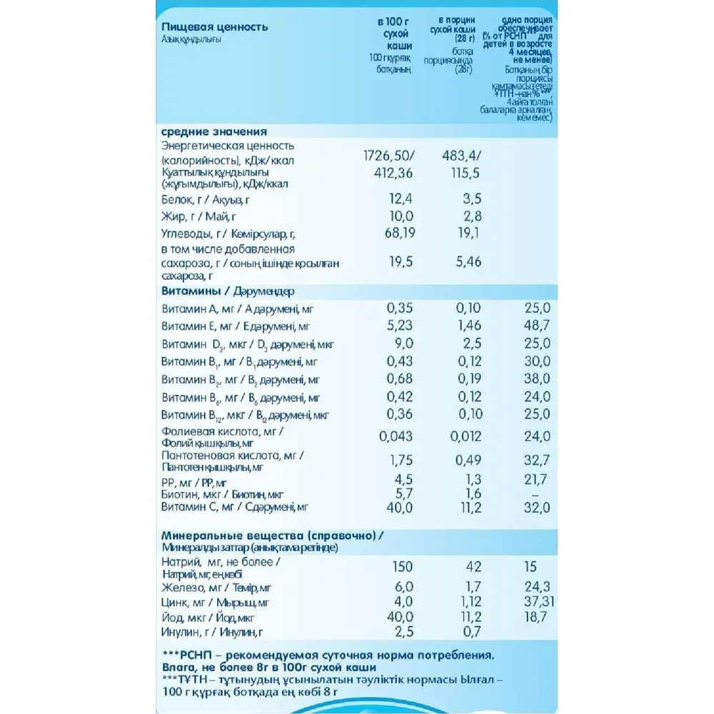 Рекомендации по употреблению: рекомендуется детям с 4 месяцев. Начинайте вводить кашу постепенно с 1 чайной ложки готового продукта. Рекомендуемое количество порций каши – 1-2 в день. Для кормления используйте только свежеприготовленную кашу. Оставшаяся после кормления порция не подлежит использованию. Рекомендуемый суточный объем готовой каши к 4-6 месяцам составляет 150 г в сутки, к 8 месяцам - 180 г, к 12 месяцам - 200 г.