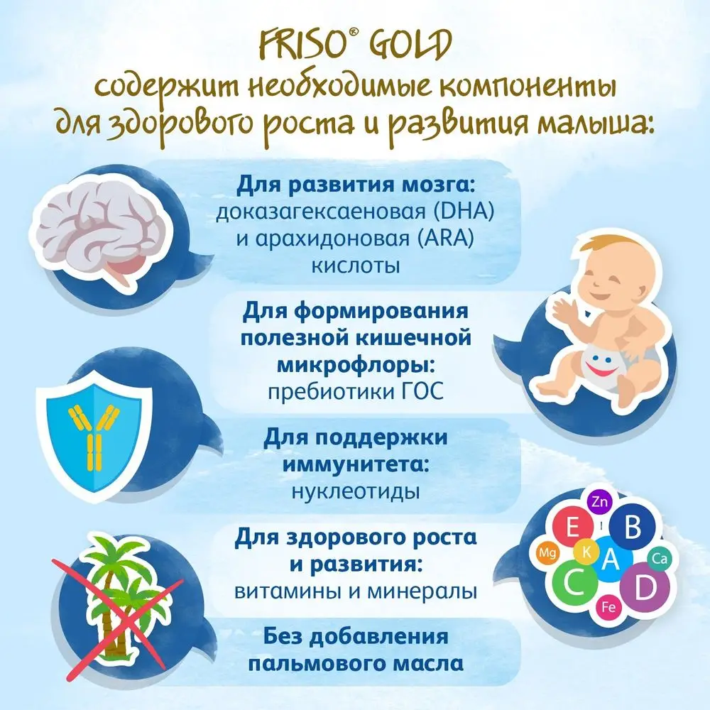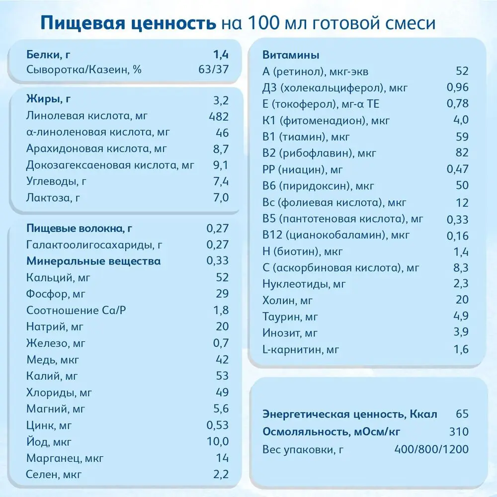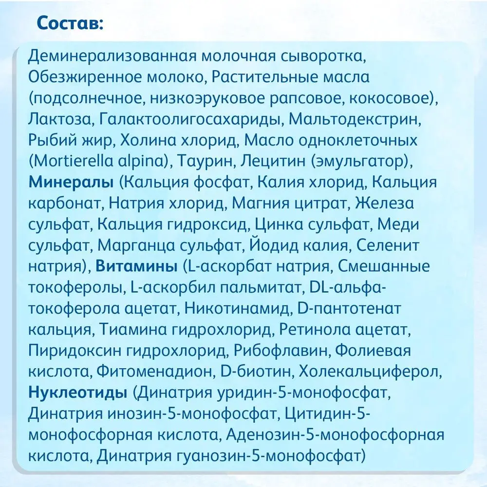 Содержит специальные жирные кислоты (DHA и ARA) для развития головного мозга и зрения у детей; пребиотики (галактоолигосахариды) для формирования полезной кишечной микрофлоры; нуклеотиды для укрепления иммунной системы;все витамины и минералы для здорового роста и развития ребенка с рождения до 6 месяцев