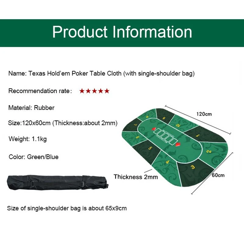 Пулевые точки: 1. Нескользящий и практичный: задняя часть коврика-резиновое дно, которое не скользит, А нижняя часть находится близко к столешнице, чтобы предотвратить скольжение по столу во время игры. 2. Коврик премиум класса: поверхность насоса настольного коврика-Это фланелевая поверхность, которая очень приятна на ощупь. 3. Легко хранить: коврик удобно хранить, на котором нет катышков, скручивания, не выцветает, каждый Настольный коврик поставляется с трубкой для переноски. 4. Правильный Размер: Размер коврика составляет около 120*60 см/47,24x23,62 дюйма, что подходит для 2-10 человек. 5. Идеально подходит для игр: Идеально подходит для семейных игр, доставит вам больше удовольствия. Характеристики: Название: Настольный коврик Texas Hold'em Материал: резиновое дно, фланелевая поверхность Размер: около 1,2x0,6 м/47,24x23,62 дюйма Толщина: около 2 мм/0,08 дюйма