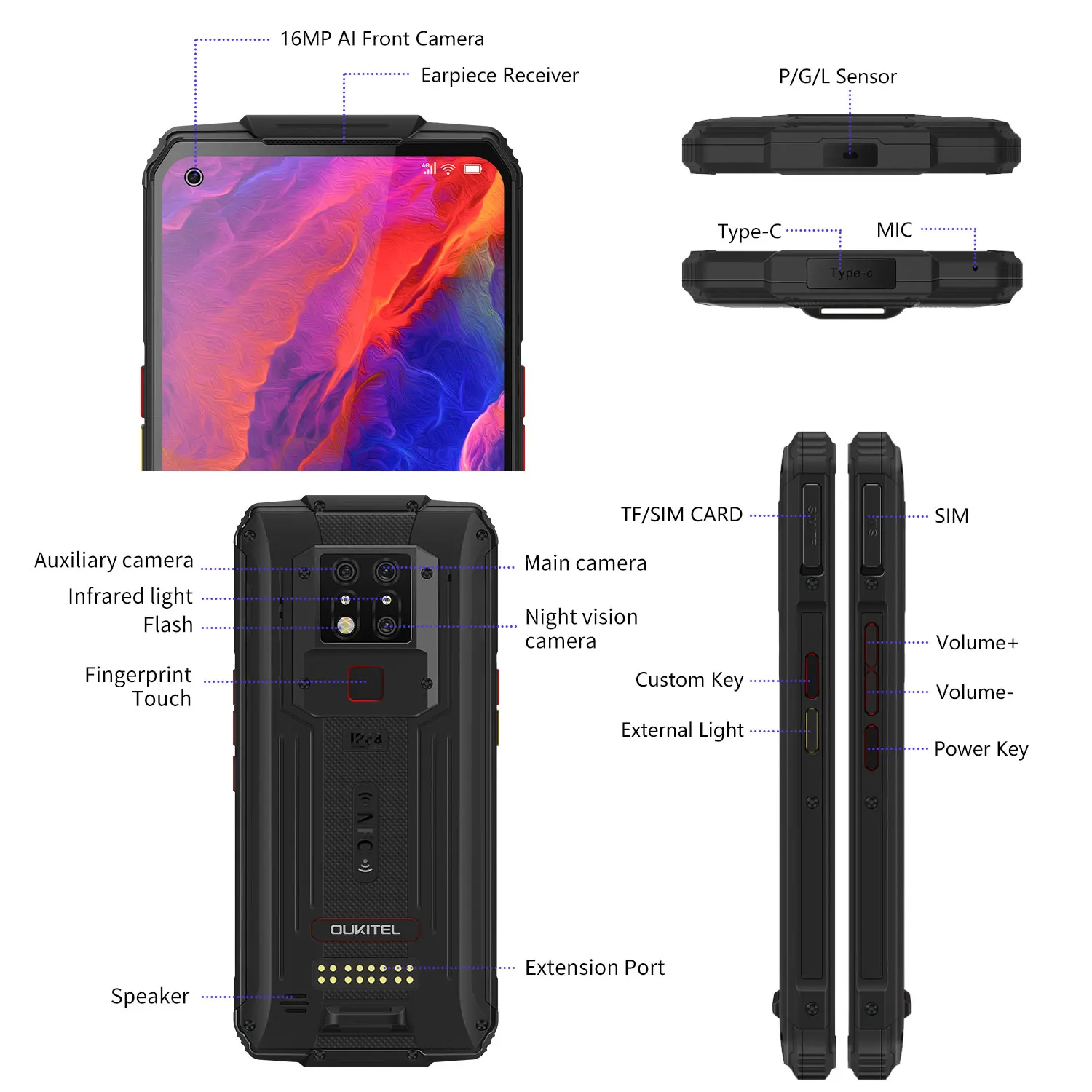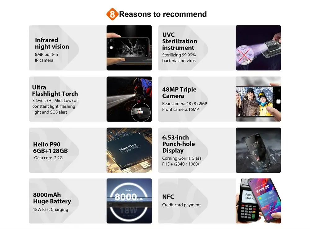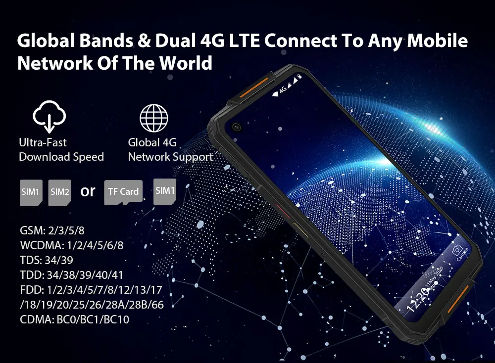 Основная особенность Процессор: MT6779 ARM Cortex A55X4, ARM Cortex A75X4 ОС: Android 10 Память: 6 Гб RAM + 128 ГБ ROM SIM: Nano + Nano/TF Размер экрана: 19,5: 9/6,53 "FHD + дисплей Фронтальная камера: 16 МП Разрешение дисплея: 1080*2340 Задняя камера: 48MP + 8MP + 2MP Аккумулятор: 8000 мАч Поддержка модуля стерилизации UVC (опционально) и модуля фонаря (опционально). Сеть 2G(GSM ):B2/B3/B5/B8 3G(WCDMA): B1/B2/B4/B5/B6/B8 4G(FDD):B1/B2/B3/B4/B5/B7/B8/B12 /B17/B19/B20 4G(TDD)B34/B38/B39/B40/B4