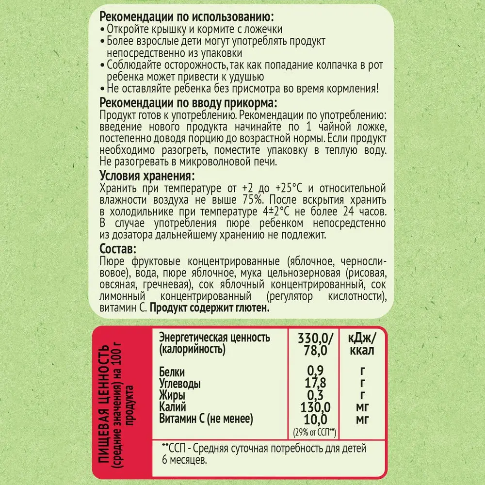 Состав: Пюре яблочное, пюре из чернослива, мука (рисовая, овсяная, гречневая), сок яблочный, сок лимонный (регулятор кислотности), витамин С. Изготовлено из концентрированных соков и пюре. Продукт содержит глютен. Содержит сахара природного происхождения.