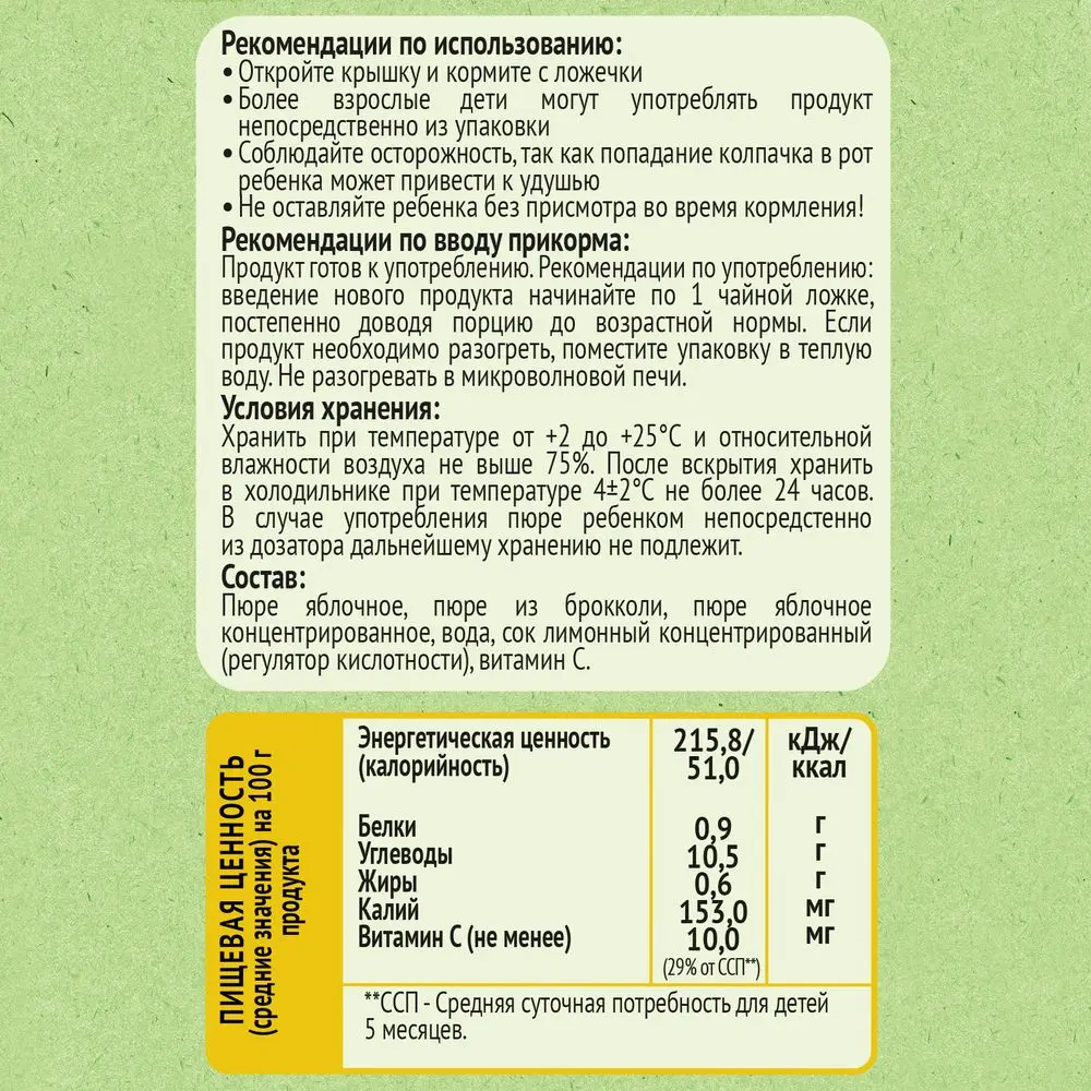 Состав: Пюре яблочное, пюре из брокколи, пюре яблочное концентрированное, вода, сок лимонный концентрированный (регулятор кислотности), витамин С.