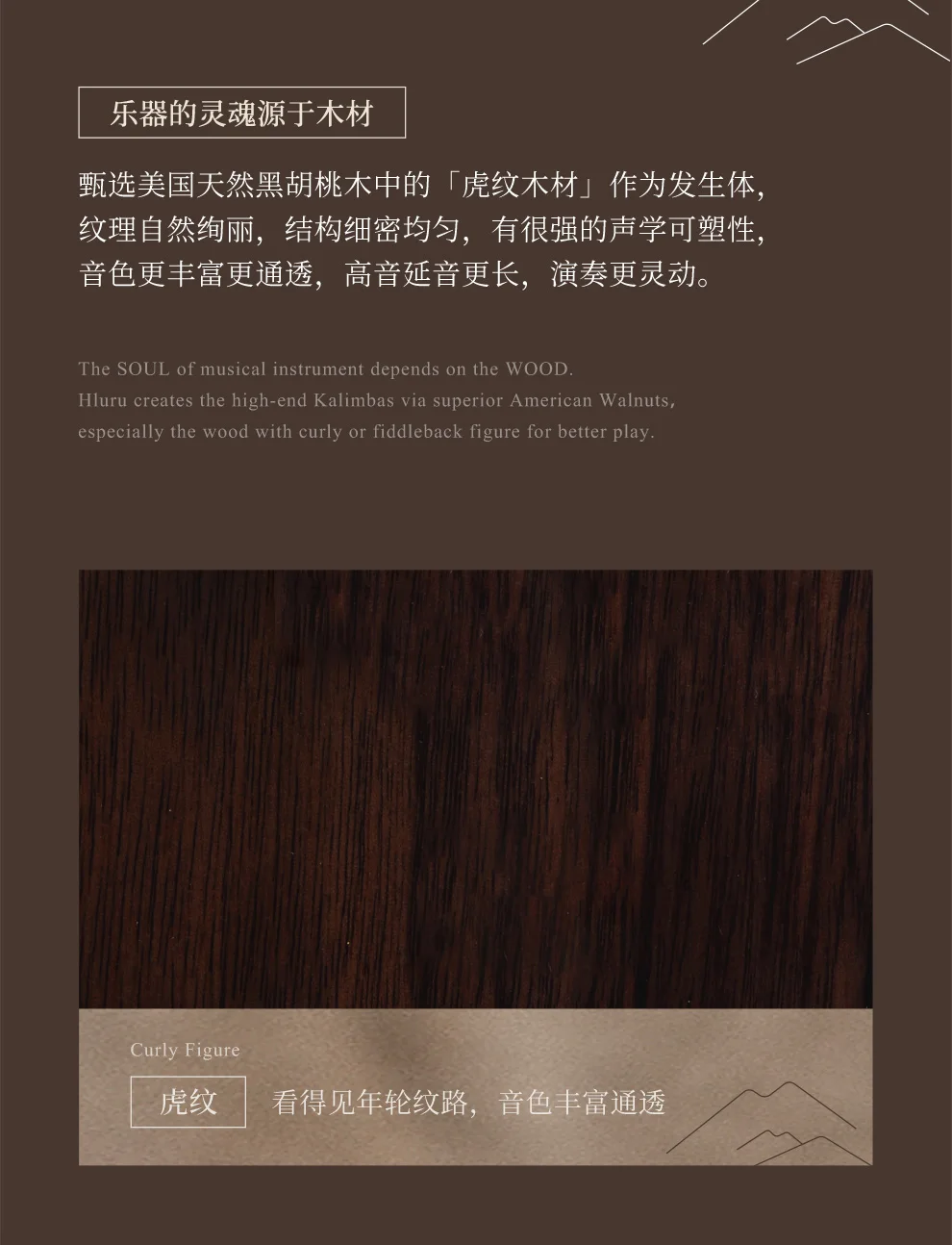 «Тигровая древесина» из американского натурального черного ореха выбрана как звучащее тело, с естественной и великолепной текстурой, тонкой и равномерной структурой, сильной акустической пластичностью, богаче и более прозрачным звуком, более высокий уровень поддержки и более гибкая производительность.