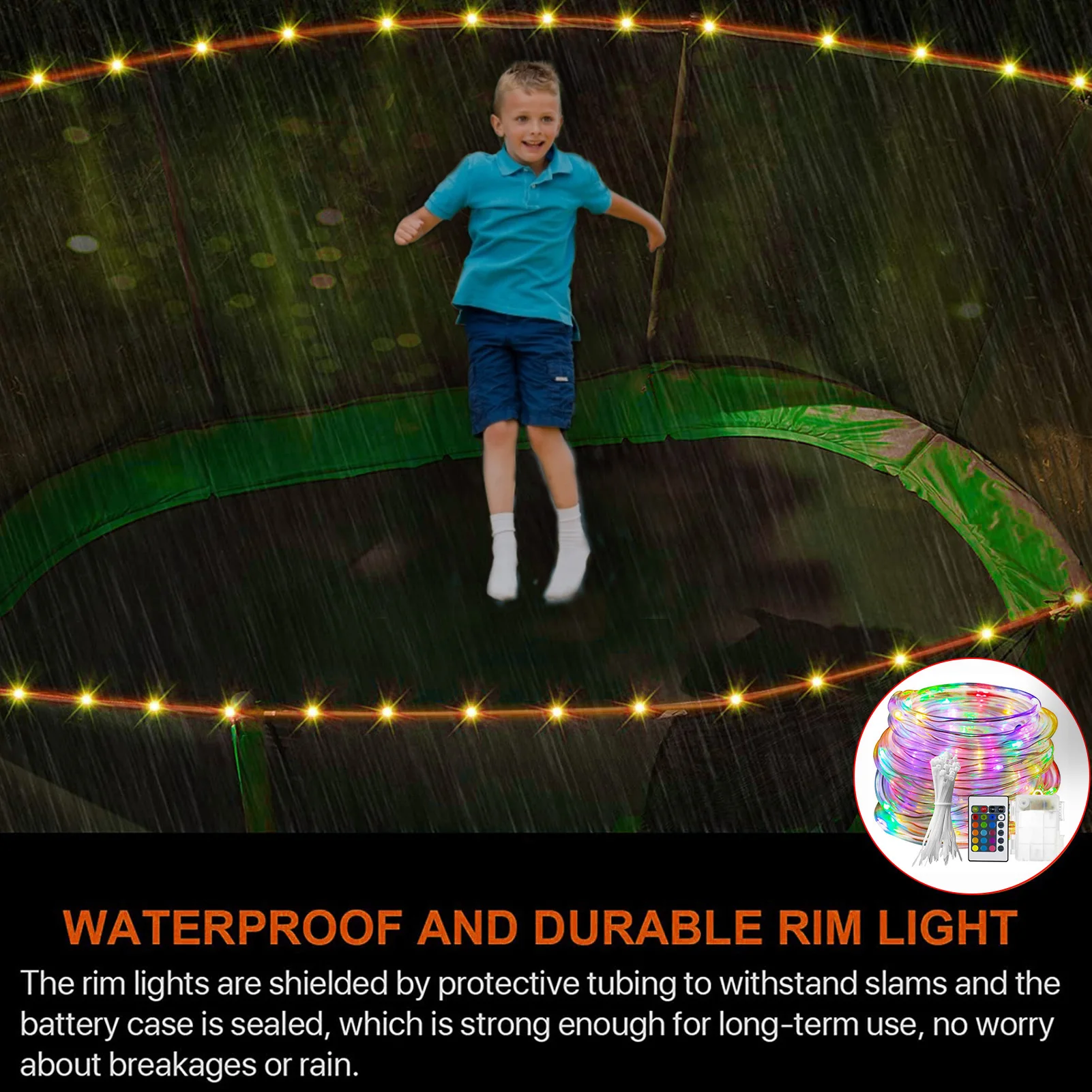 4. Простота установки: гибкий светильник-полоска позволяет свободно сгибать или выворачивать форму, просто используйте застежку-молнию, чтобы связать светодиодный светильник по краям. Затем поместите батарейный блок под батут и Используйте пульт дистанционного управления для выбора яркости, цвета, режима, чувствительности к переплету и вкл/выкл.