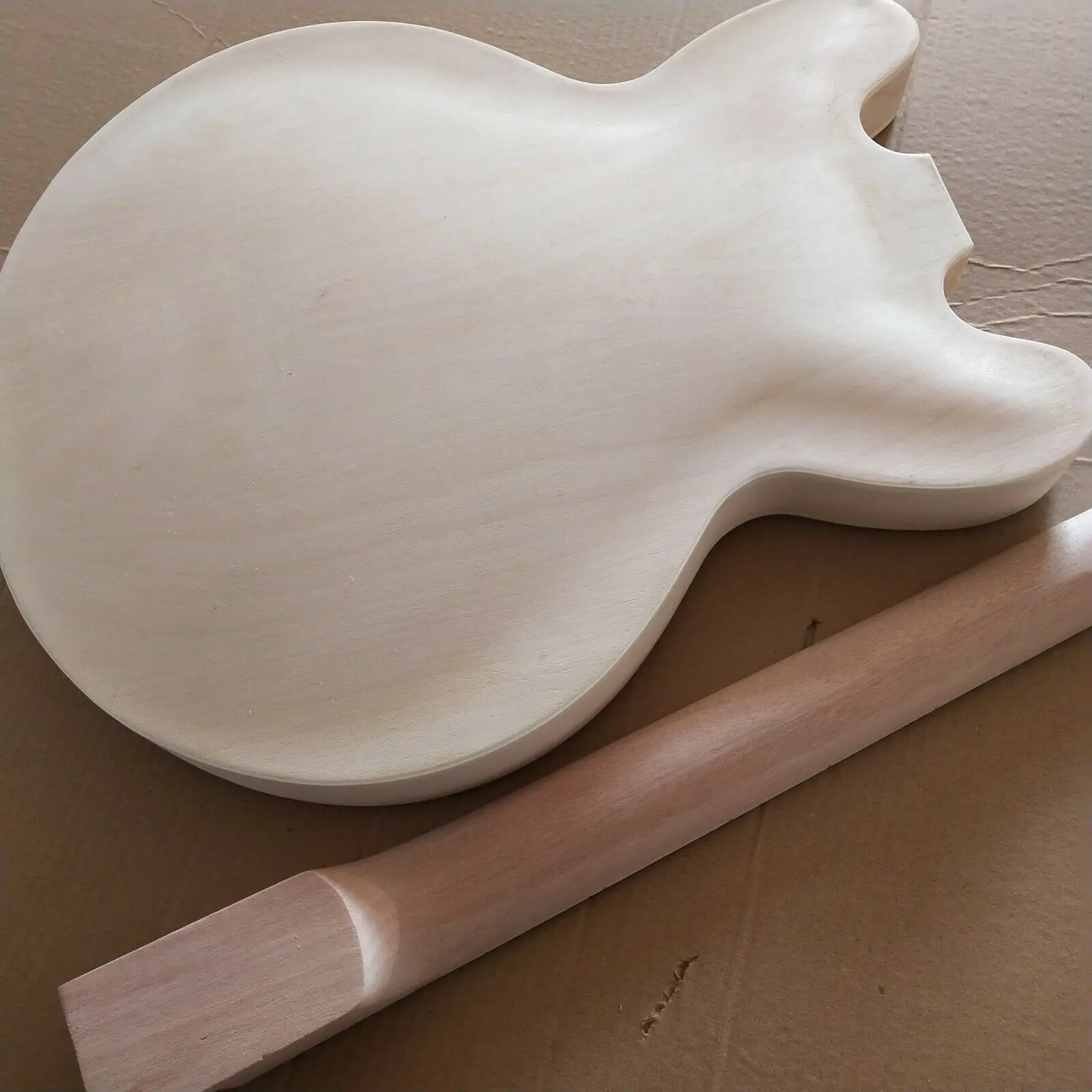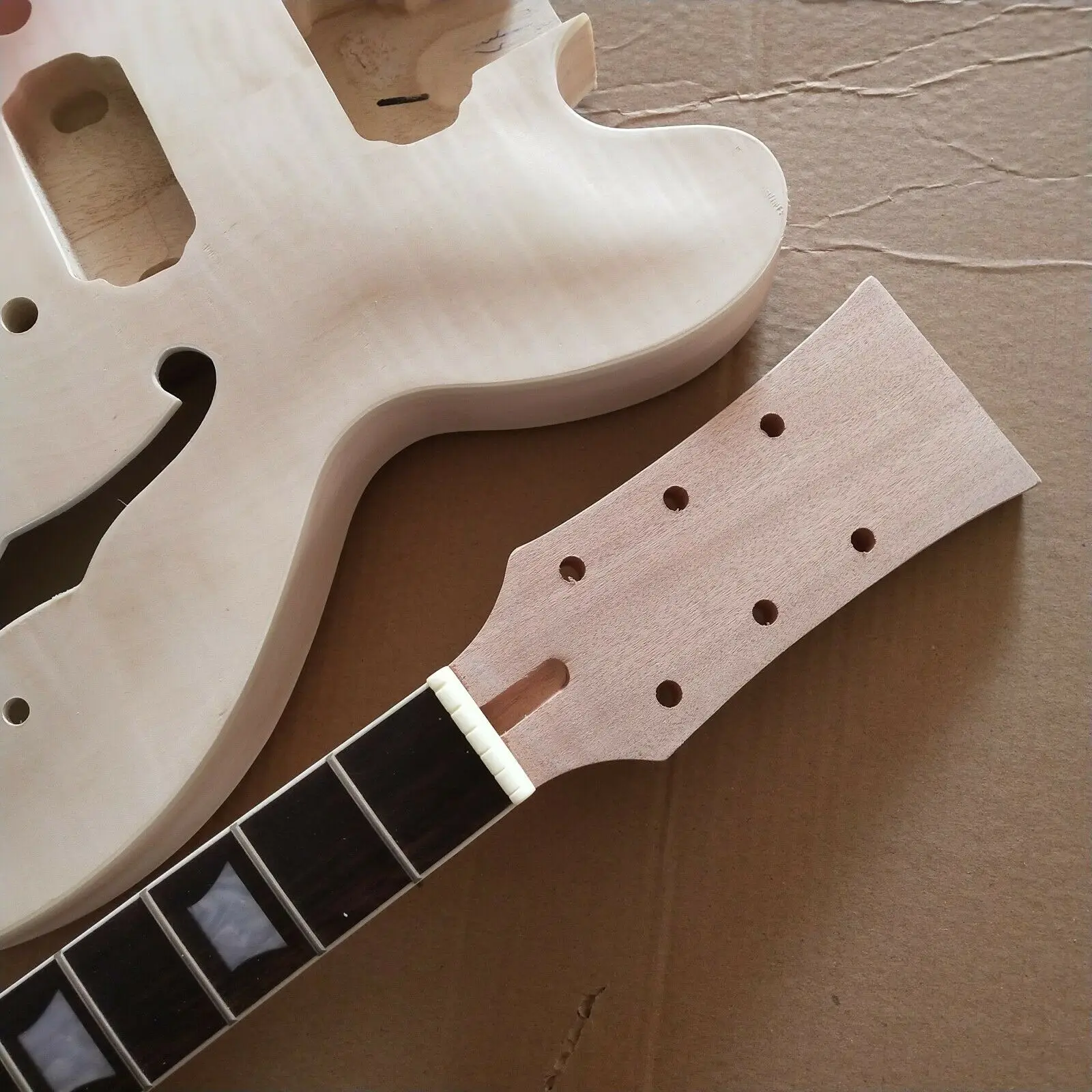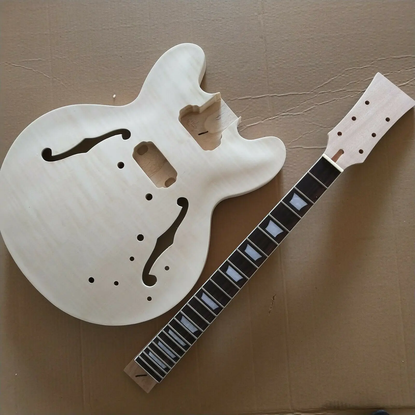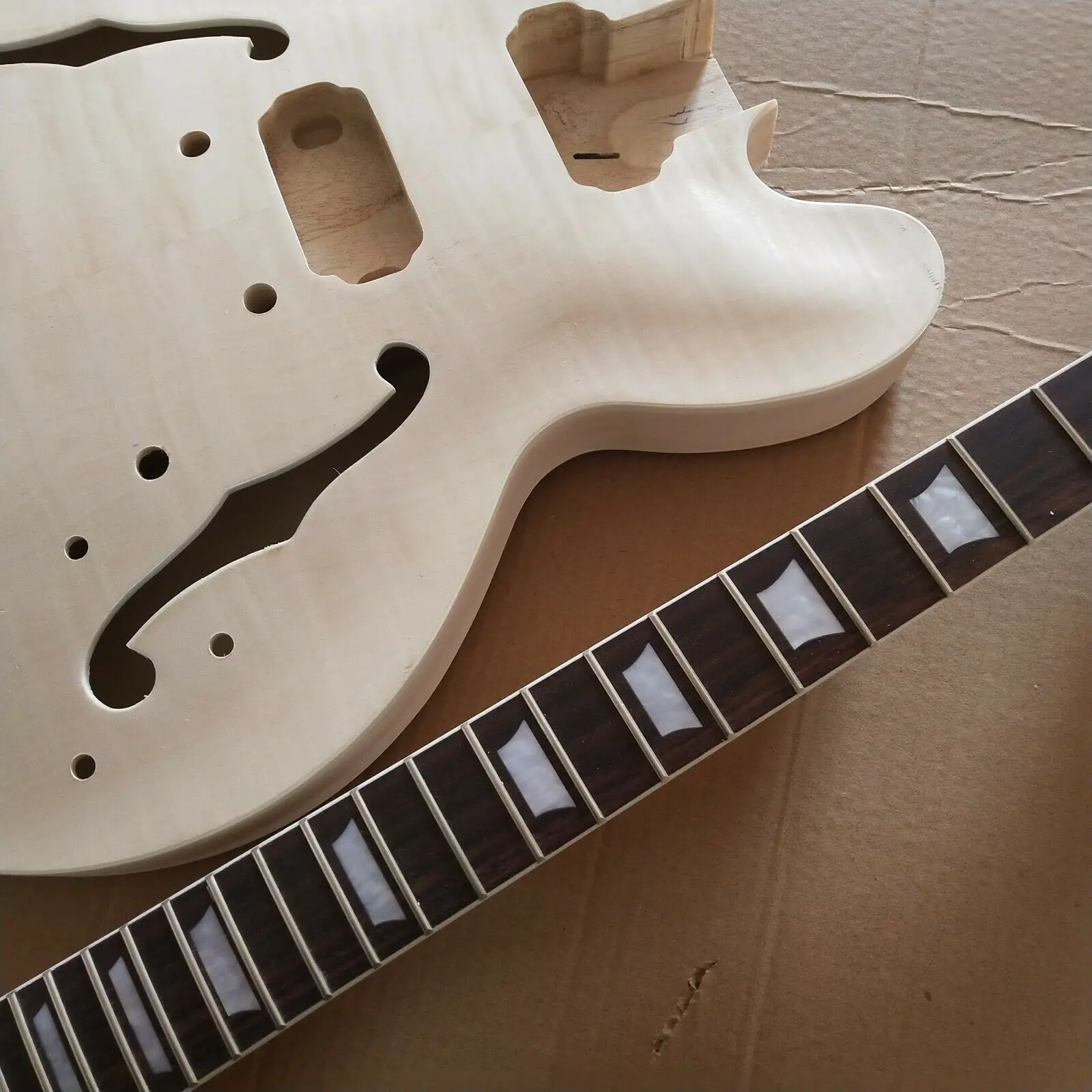 Новый лучший набор для электрогитары DIY. Шея гитары: гриф из розового дерева, инкрустация жемчужным блоком. Гитары Корпус: 0,6 мм пламени кленовый шпон + черного красного цвета. Полый корпус арки. Вес: около 2,1 кг.