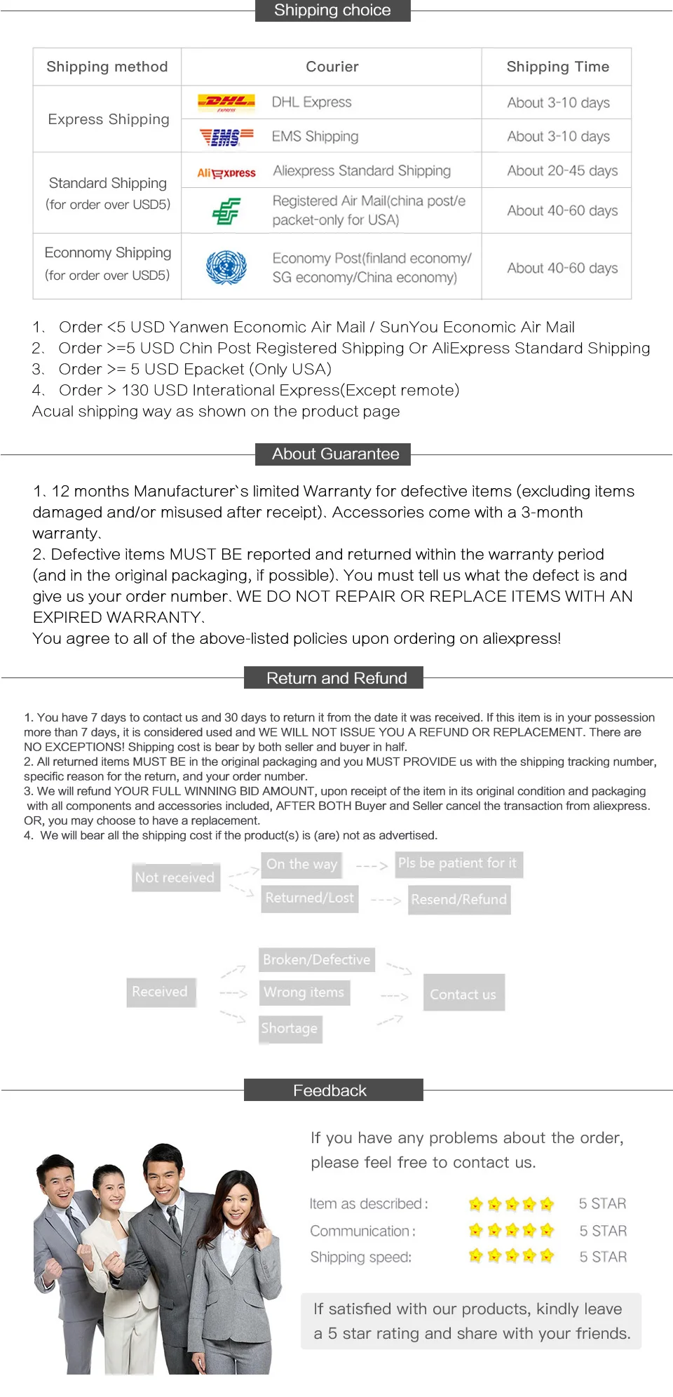 5. Если у вас есть какие-либо проблемы с товаром, пожалуйста, свяжитесь с нами, прежде чем начать спор с нашим бизнесом!