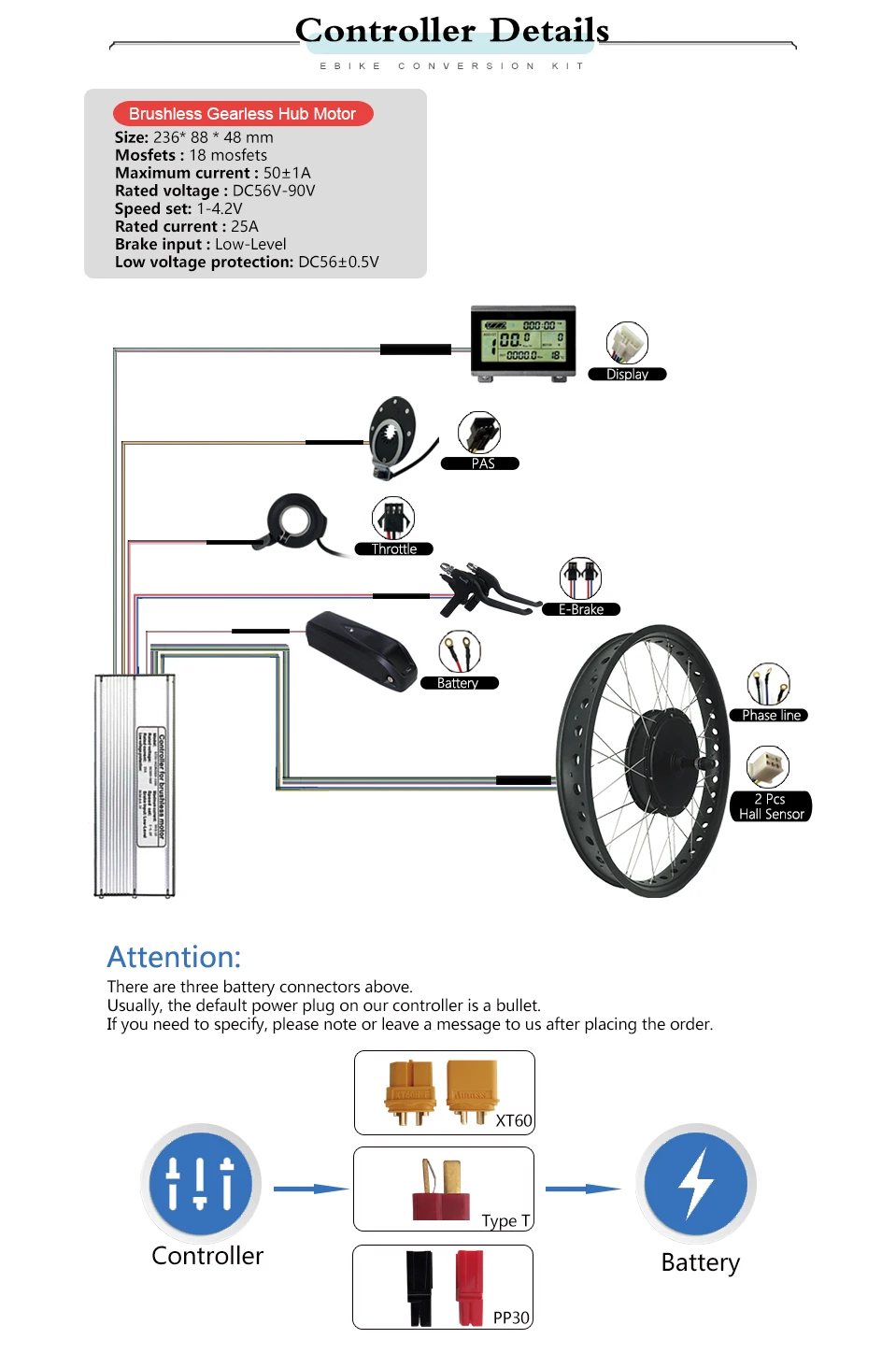 Внимание: максимальный ток, который может пройти контроллер, составляет 50 А, пожалуйста, не превышайте его, и мы отказываемся компенсировать ущерб контроллеру в связи с этим