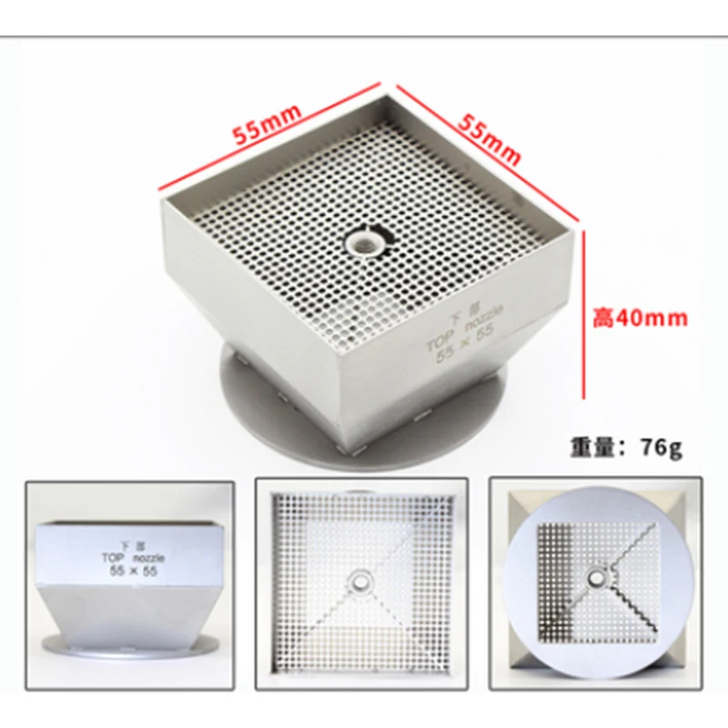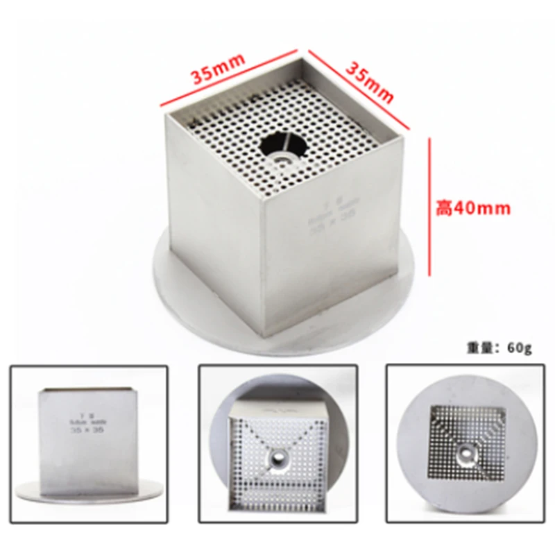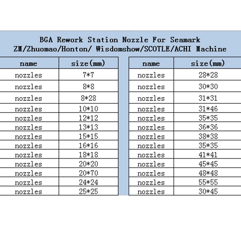 Это сопло подходит для использования на станциях переделки таких брендов, как Seamark Zhuomao, Hongteng, Dinghua, Zhicheng, jindonesia gfeng и Beijing MicroPort. Сопло изготовлено из титанового сплава, тонкой работы и стандартного размера. Диаметр дна сопла составляет 58 мм, а высота-40 мм. Длина и ширина определяются в соответствии с чипом, который вам нужно припаять (например, если размер вашего чипа 26*41 мм, вы можете выбрать сопло 29*44 мм). Рекомендуется покупать верхнюю и нижнюю части вместе, улучшенный эффект подбора верхней и нижней частей.