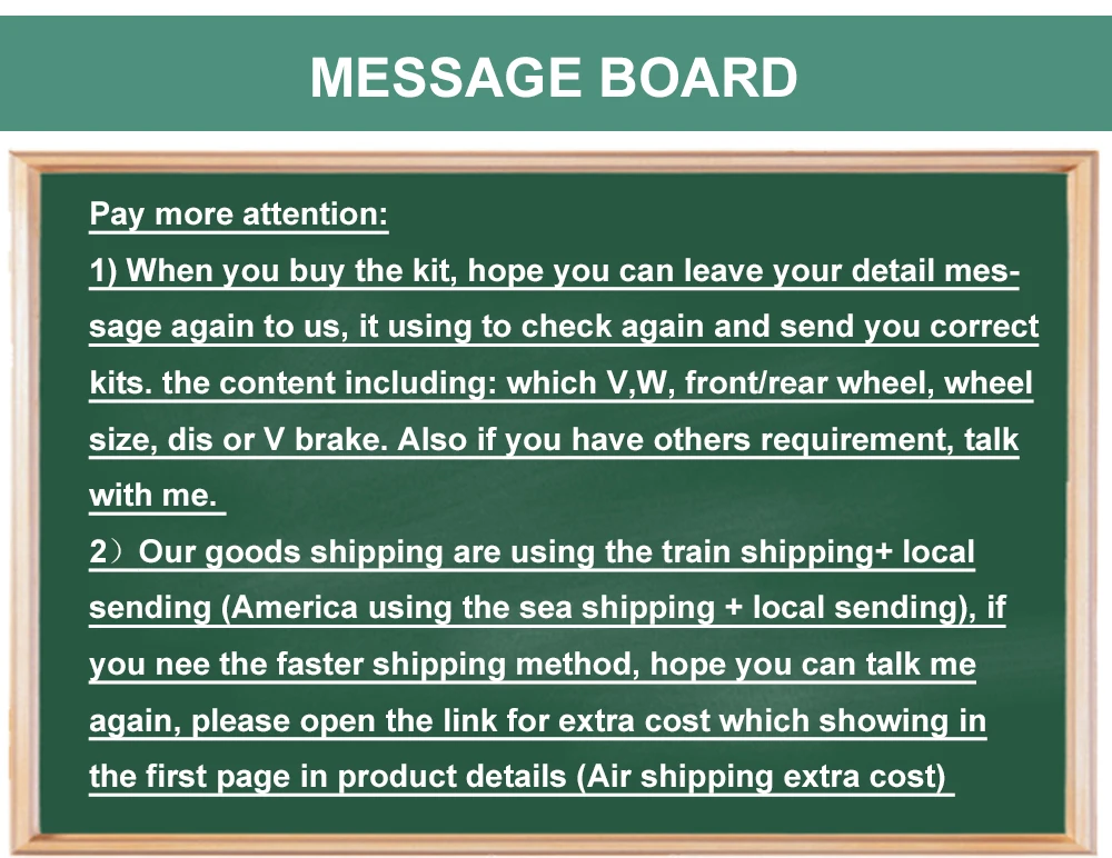 (1) Когда вы размещаете заказ, надеюсь, вы можете оставить сообщение снова, для которого напряжение и мощность, переднее/заднее колесо, дюймовое колесо, V или дисковый тормоз и принимает ли способ доставки по умолчанию. Нам будет удобнее подготовить вам правильный товар. Если вы не оставите сообщение о заполнении и не ответите мне перед отправкой, мы отправим товар по умолчанию в одном комплекте и по умолчанию.